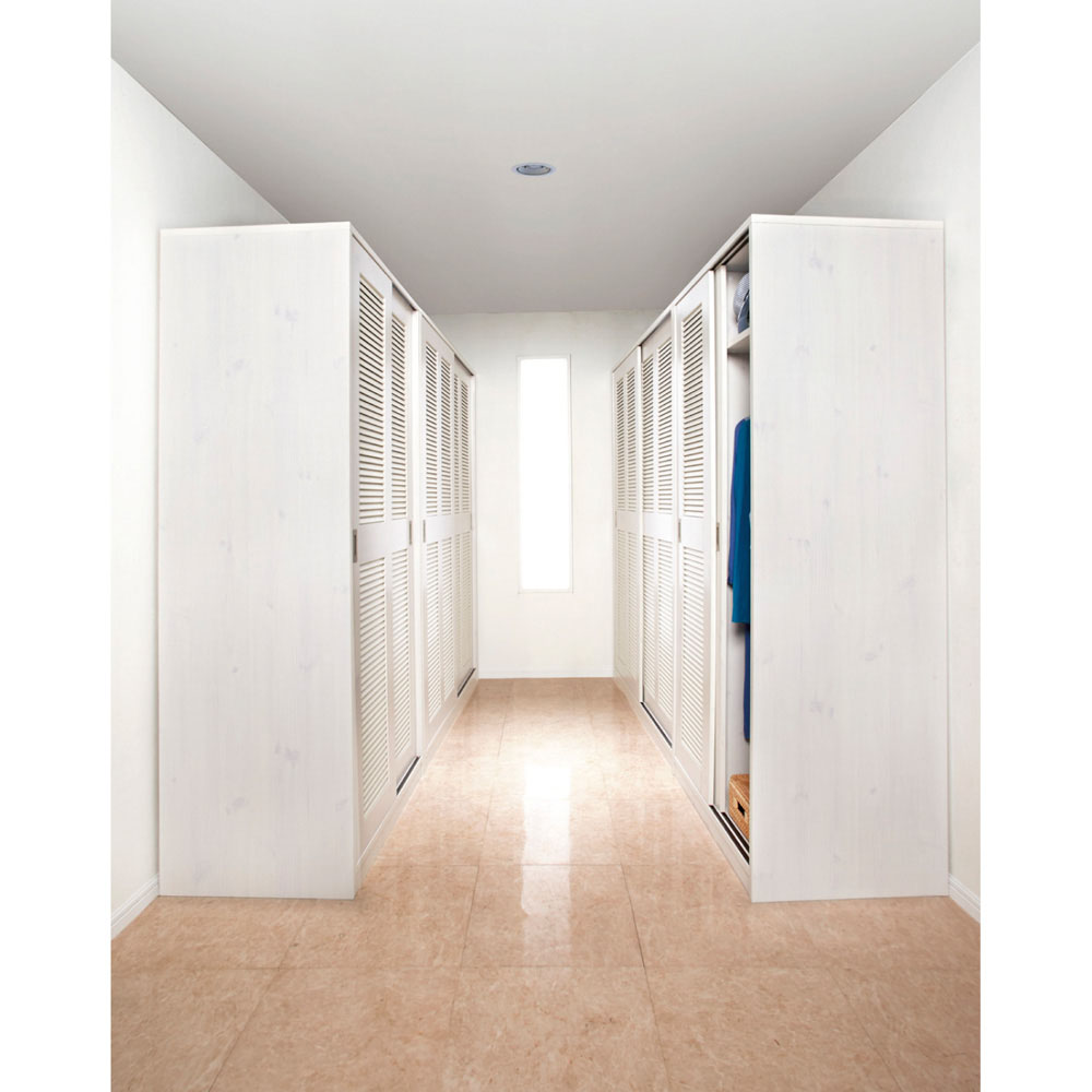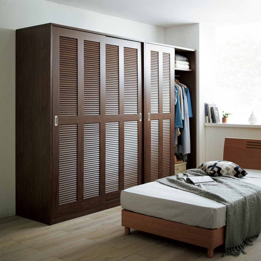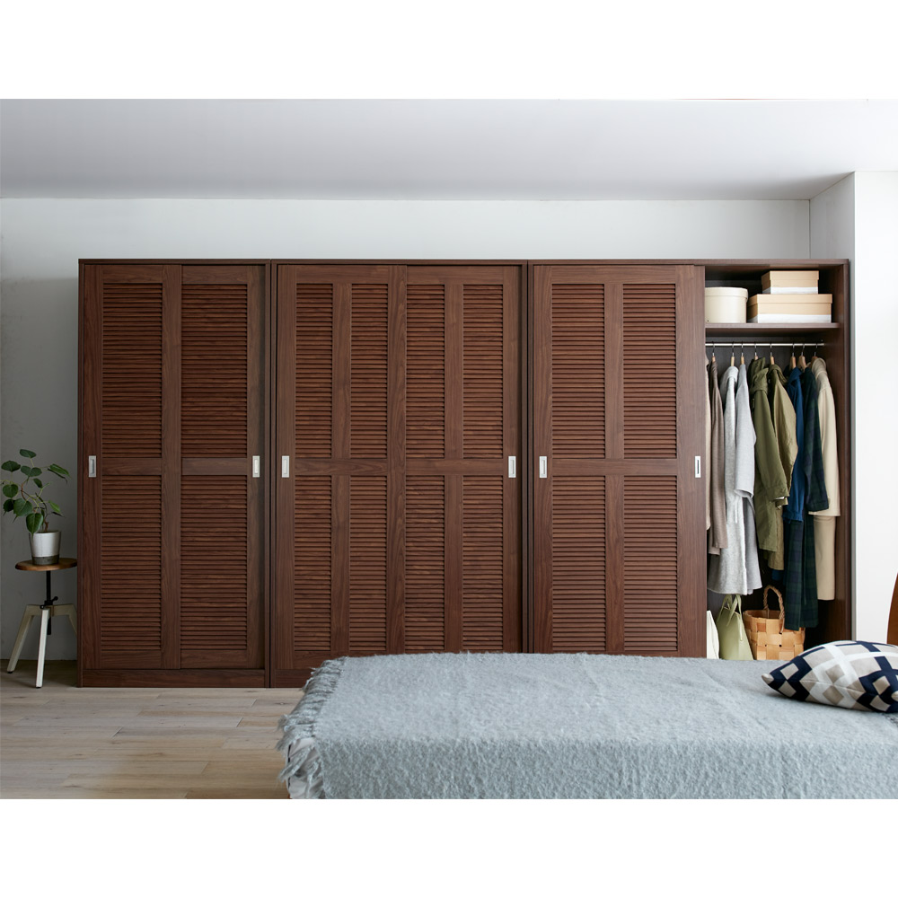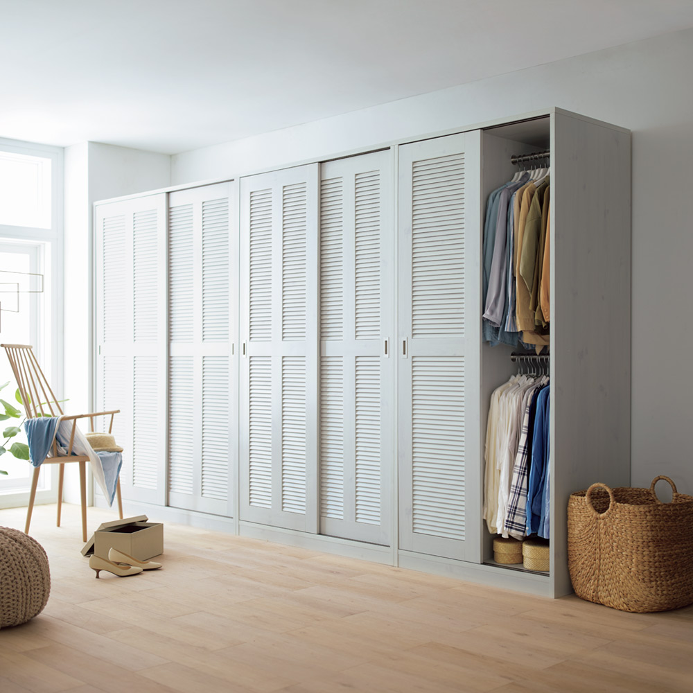 ●お部屋に大容量の衣類収納空間を作り出す、ルーバー引き戸クローゼット。●清潔感があり、お部屋に広がりを持たせるホワイトと、シックで高級感のあるダークブラウンの2色からお選びいただけます。