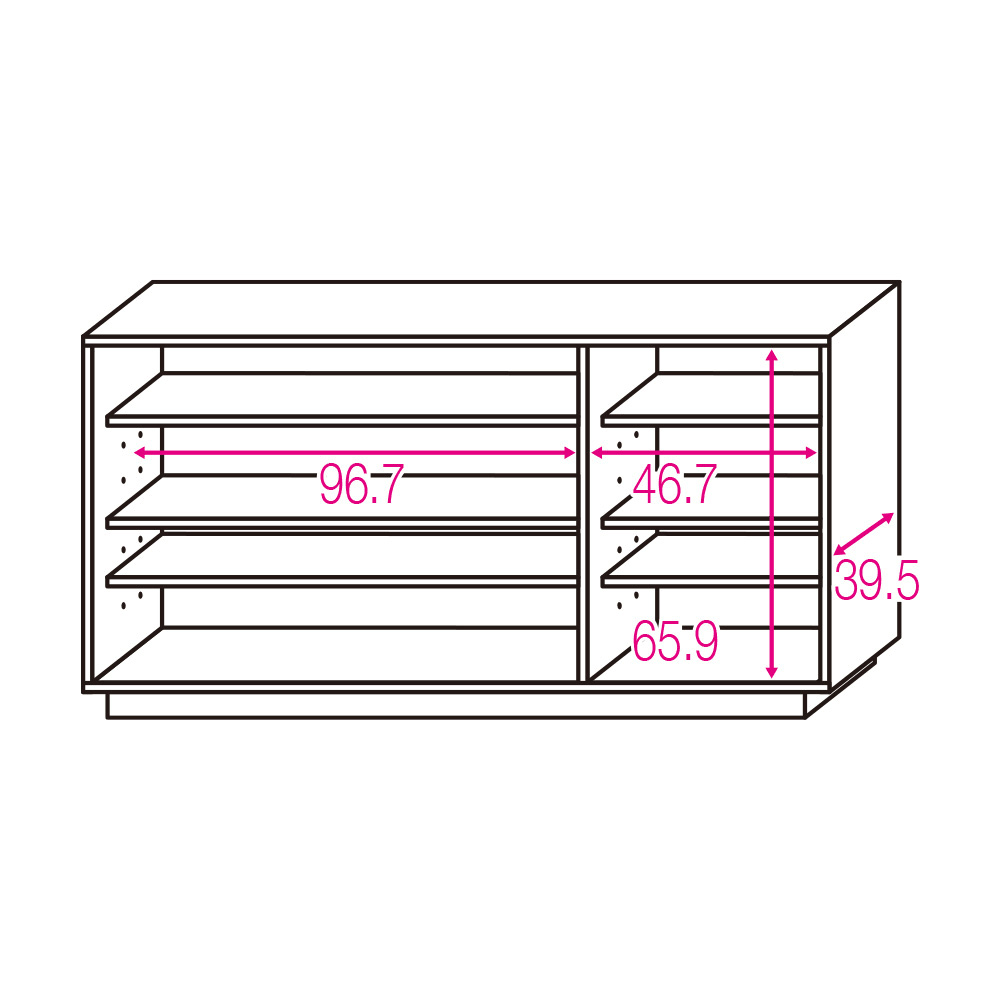 ※赤文字は内寸(単位:cm) 可動棚板6枚。左収納棚板サイズ:幅96.7×奥行32 右収納棚板サイズ:幅46.7×奥行32