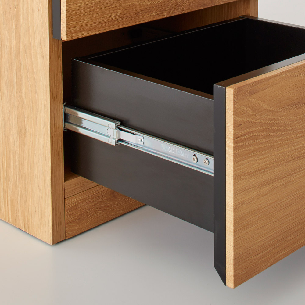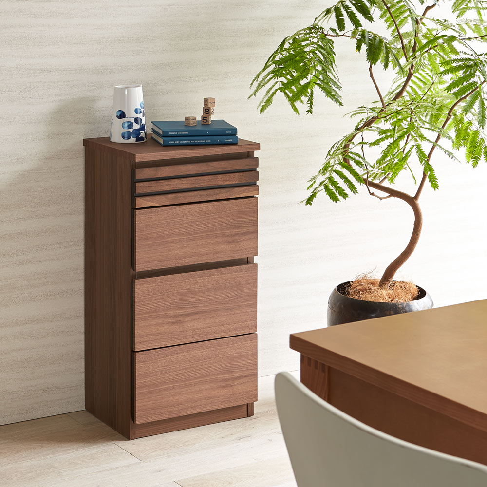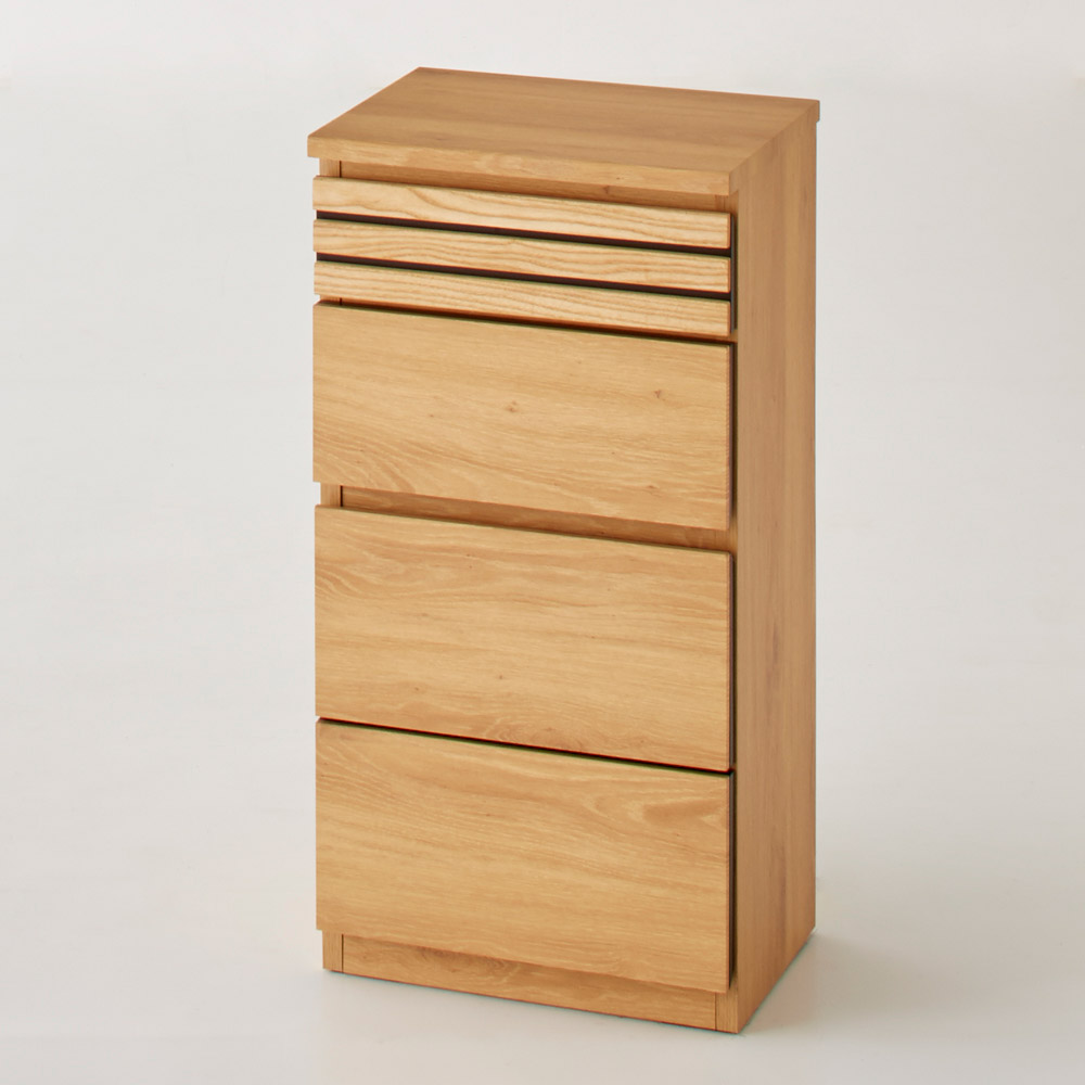 天然木のリッチな質感が魅力のコンパクトなチェストです。引き出しは奥までしっかりと引き出すことができるフルスライドレールを採用。