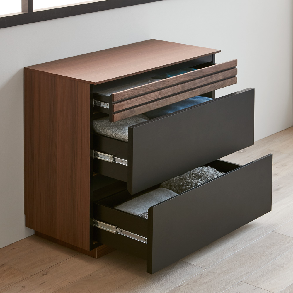■引き出しは開閉がスムーズなレール付。最下段は奥のモノも出し入れしやすいフルスライドレール。■奥までしっかり引き出し事が出来るので、奥にしまった衣類も簡単に出し入れできます。
