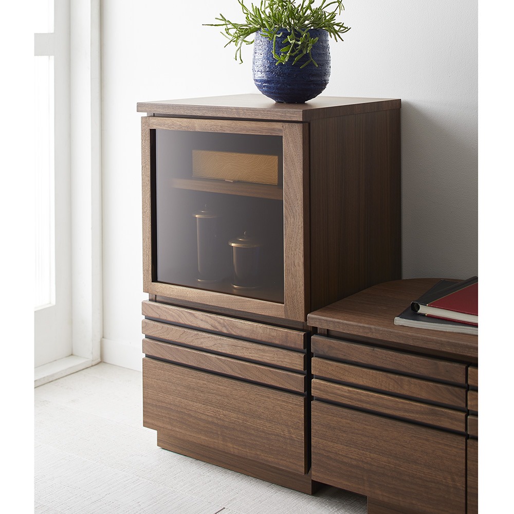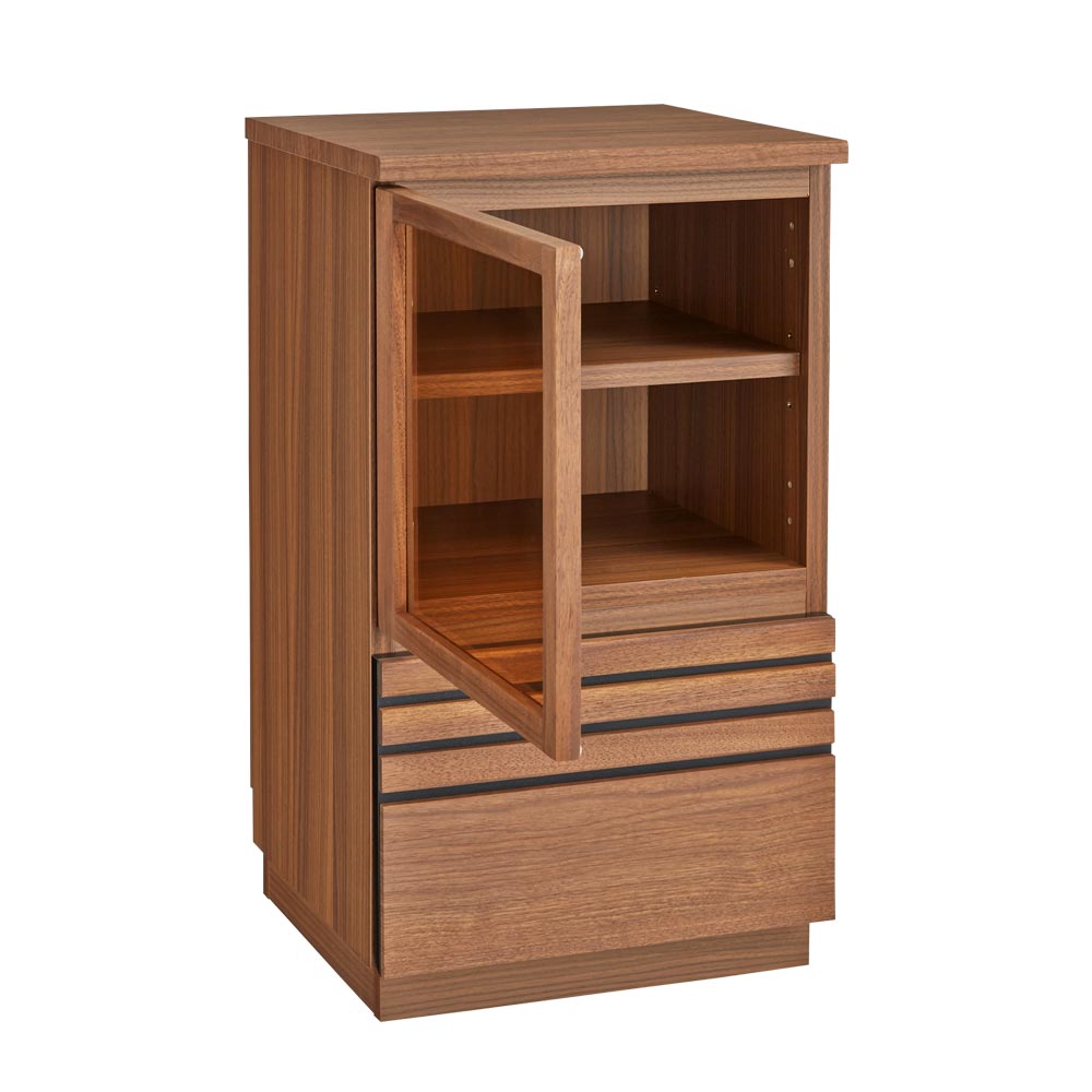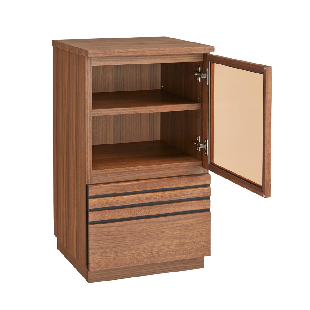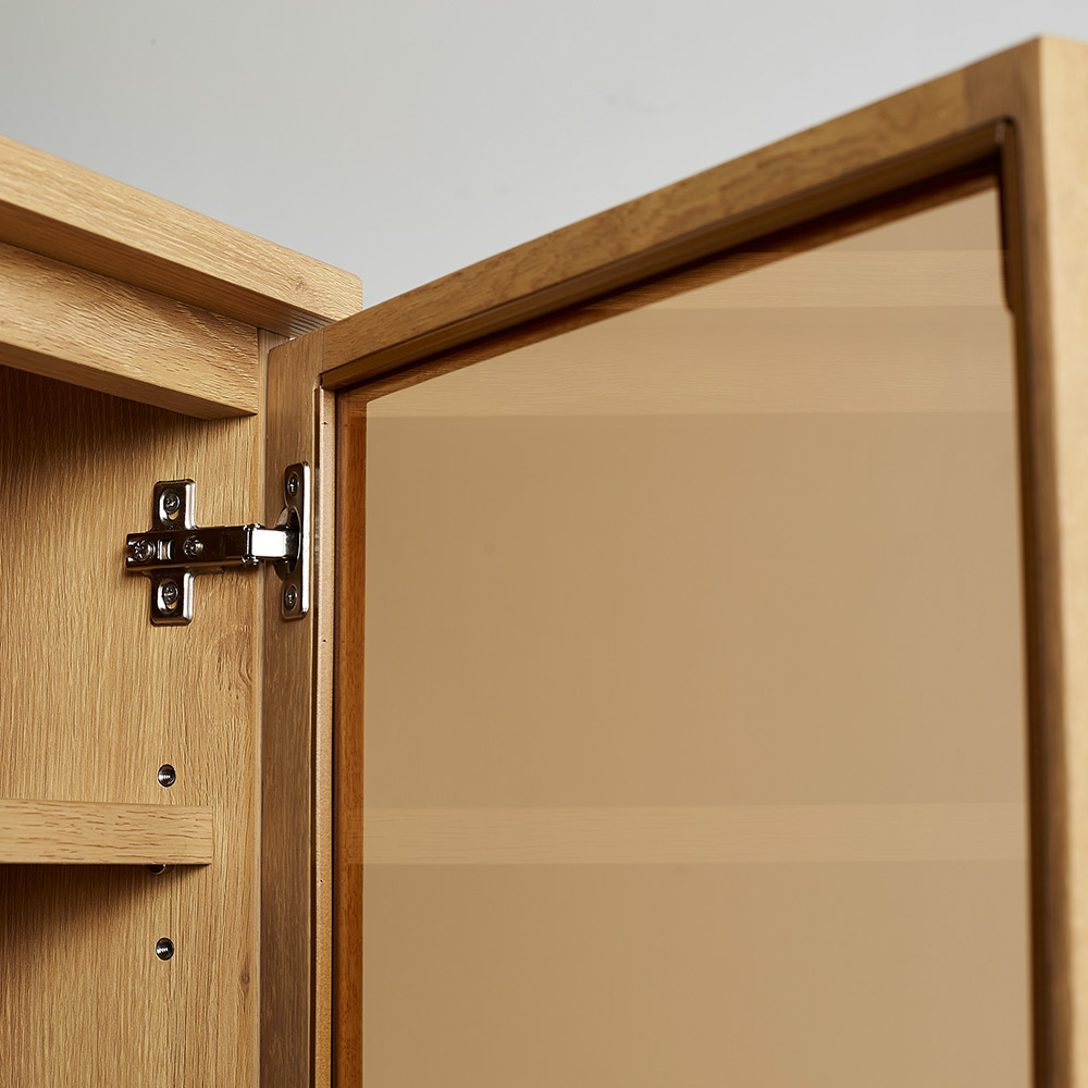 扉のガラスは、ブロンズ色の透明ガラス。インテリアを格調高くコーディネート。右開きでの完成品でお届けします。お部屋の都合に合わせて、左開きに取り付けていただくこともできます。