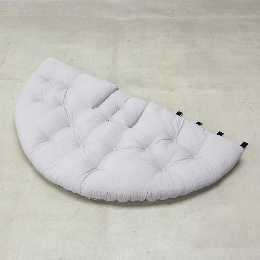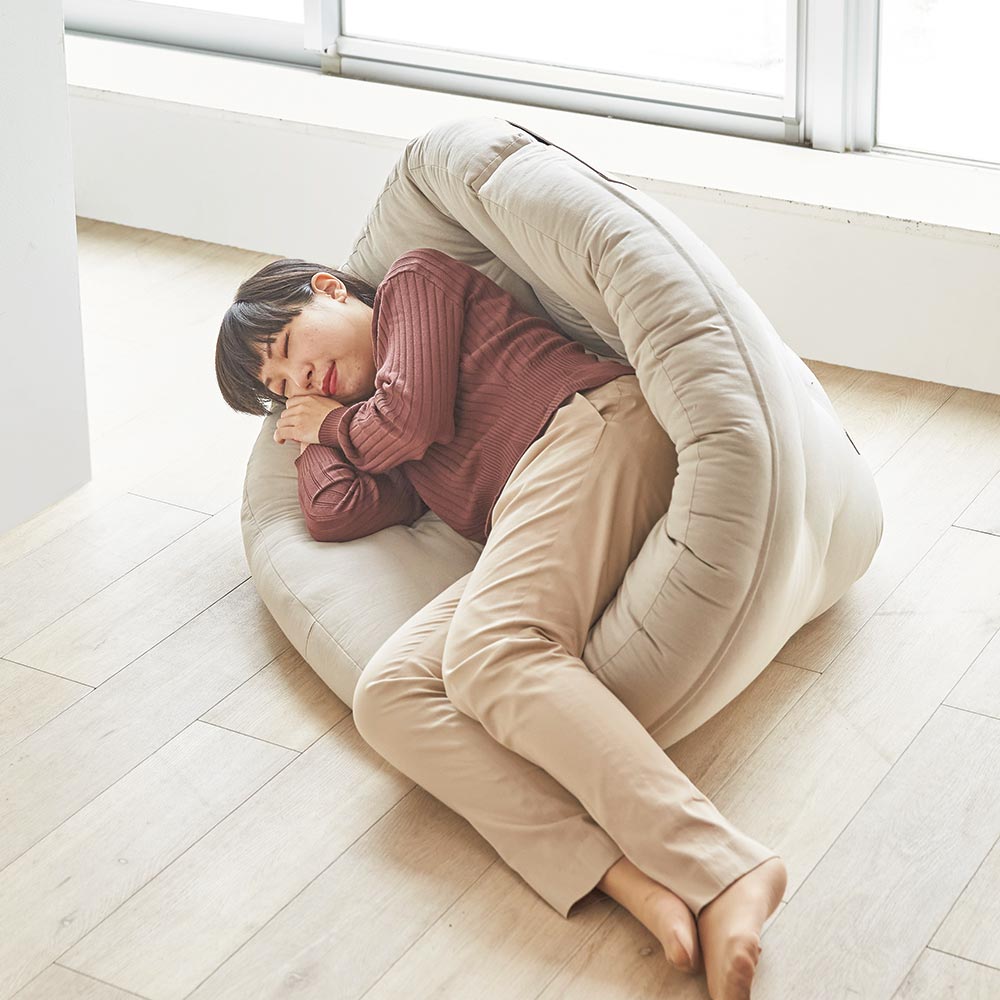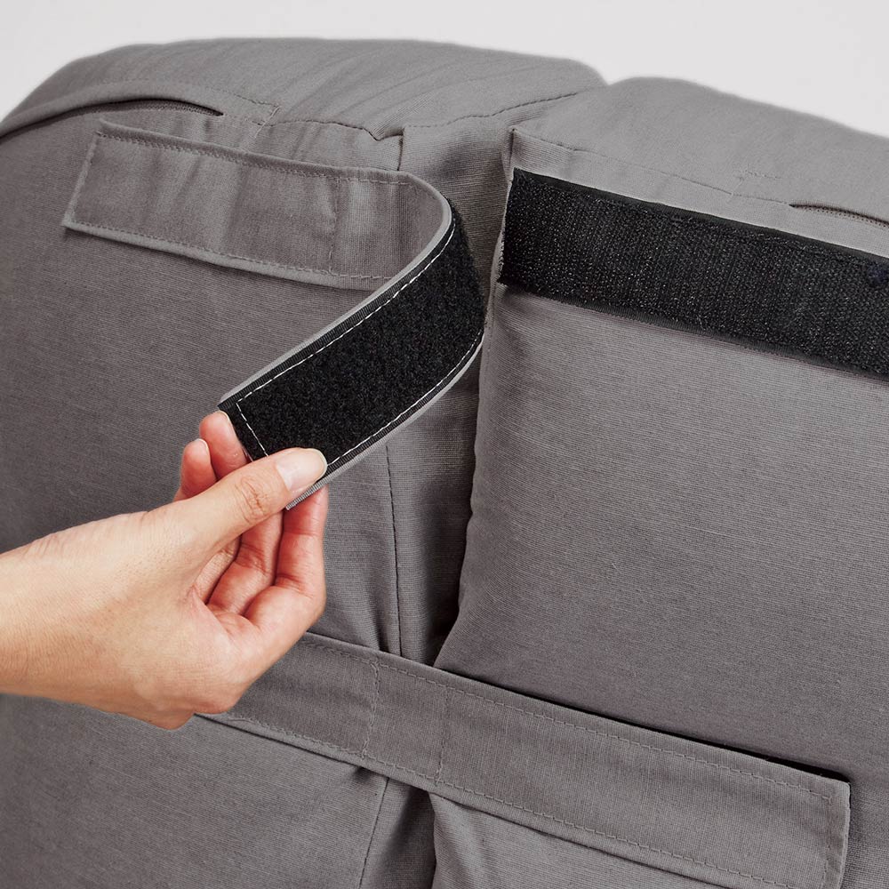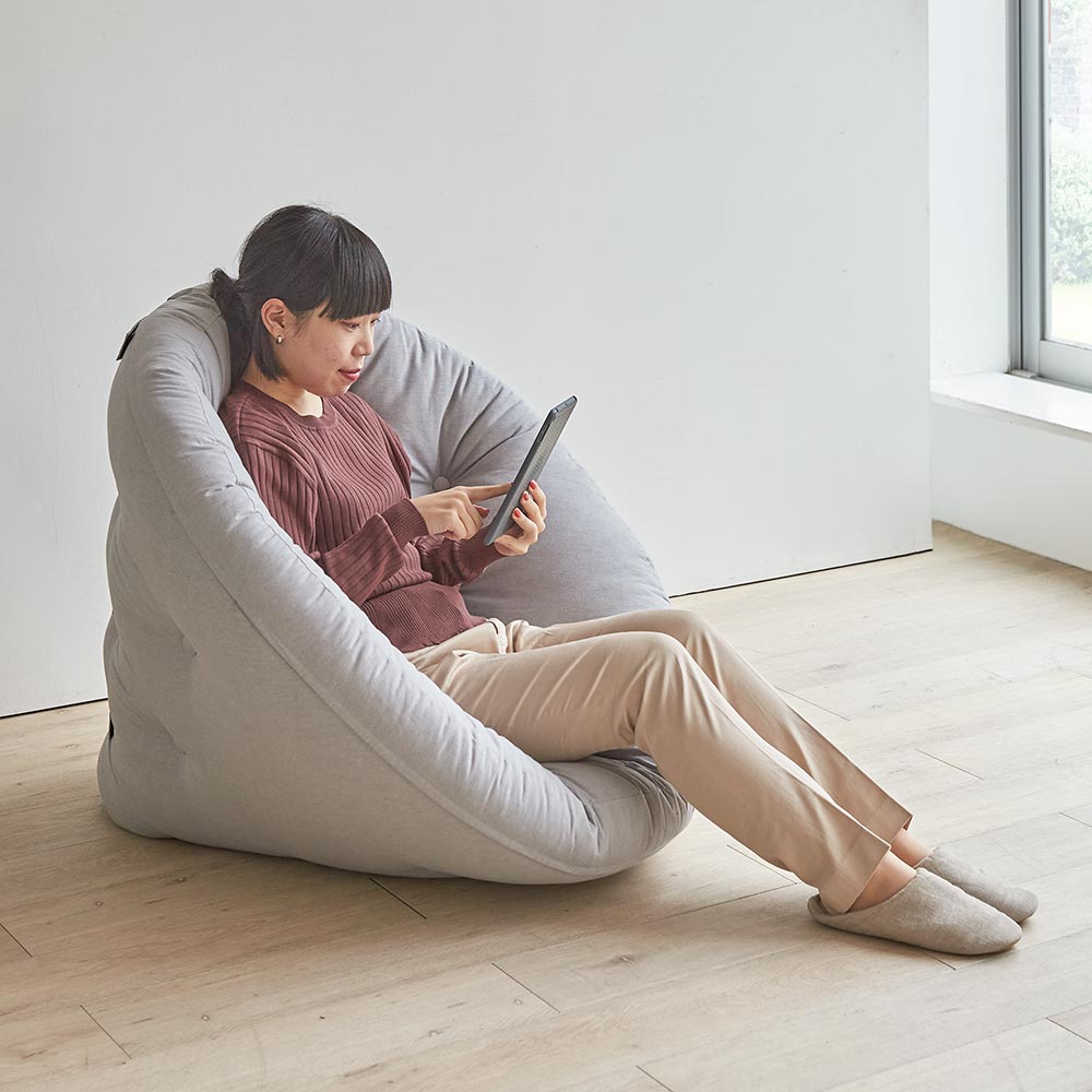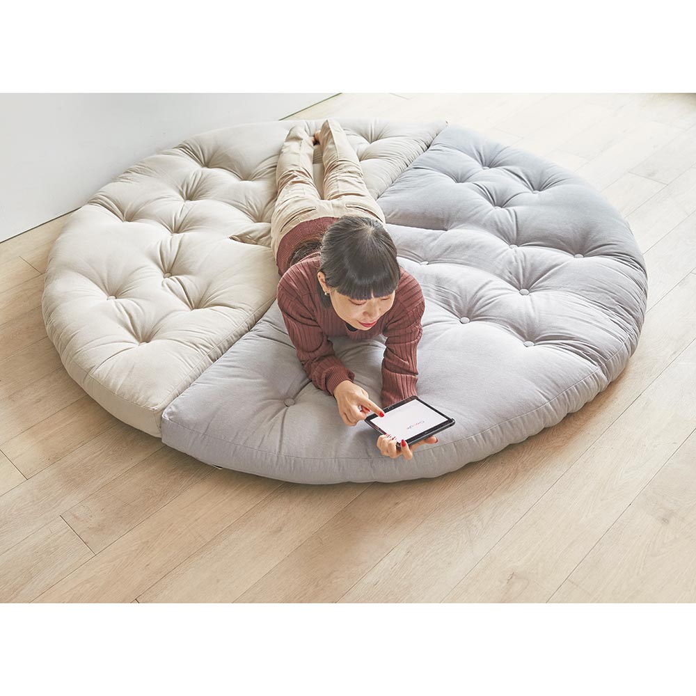 ゆったり包み込まれるような2wayクッション。背中がほどよく支えられ、フラットにすればごろ寝にも。◎背面のマジックテープを外すと半円型のフラットクッションに。