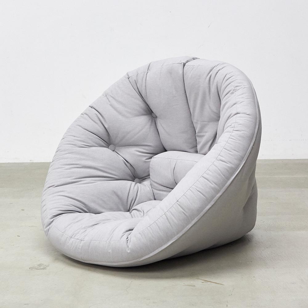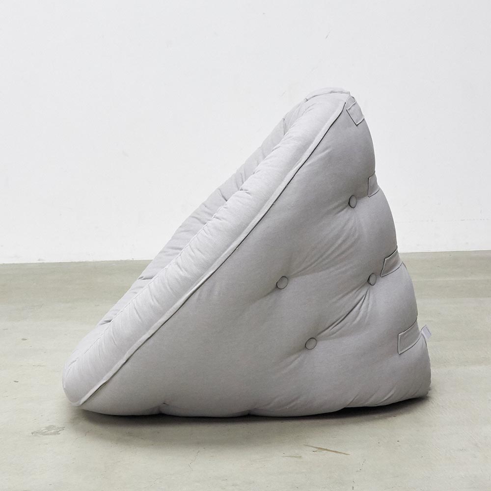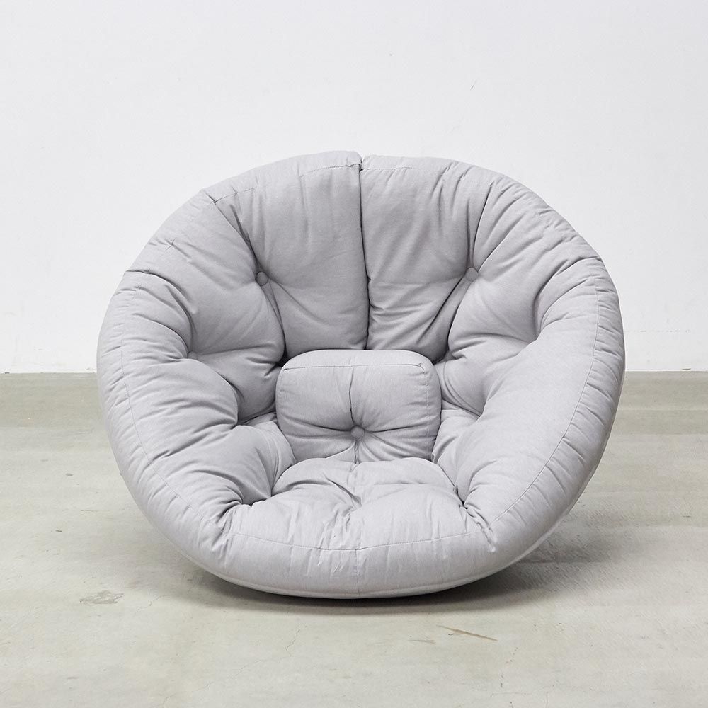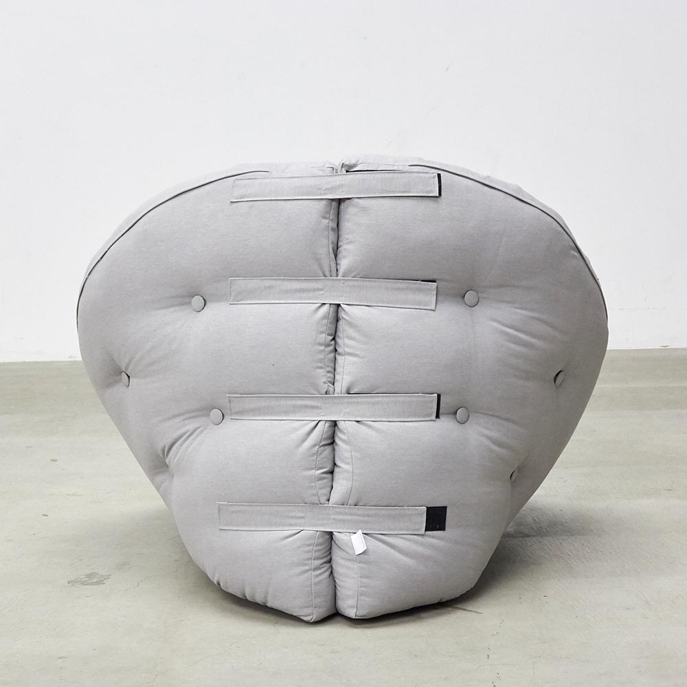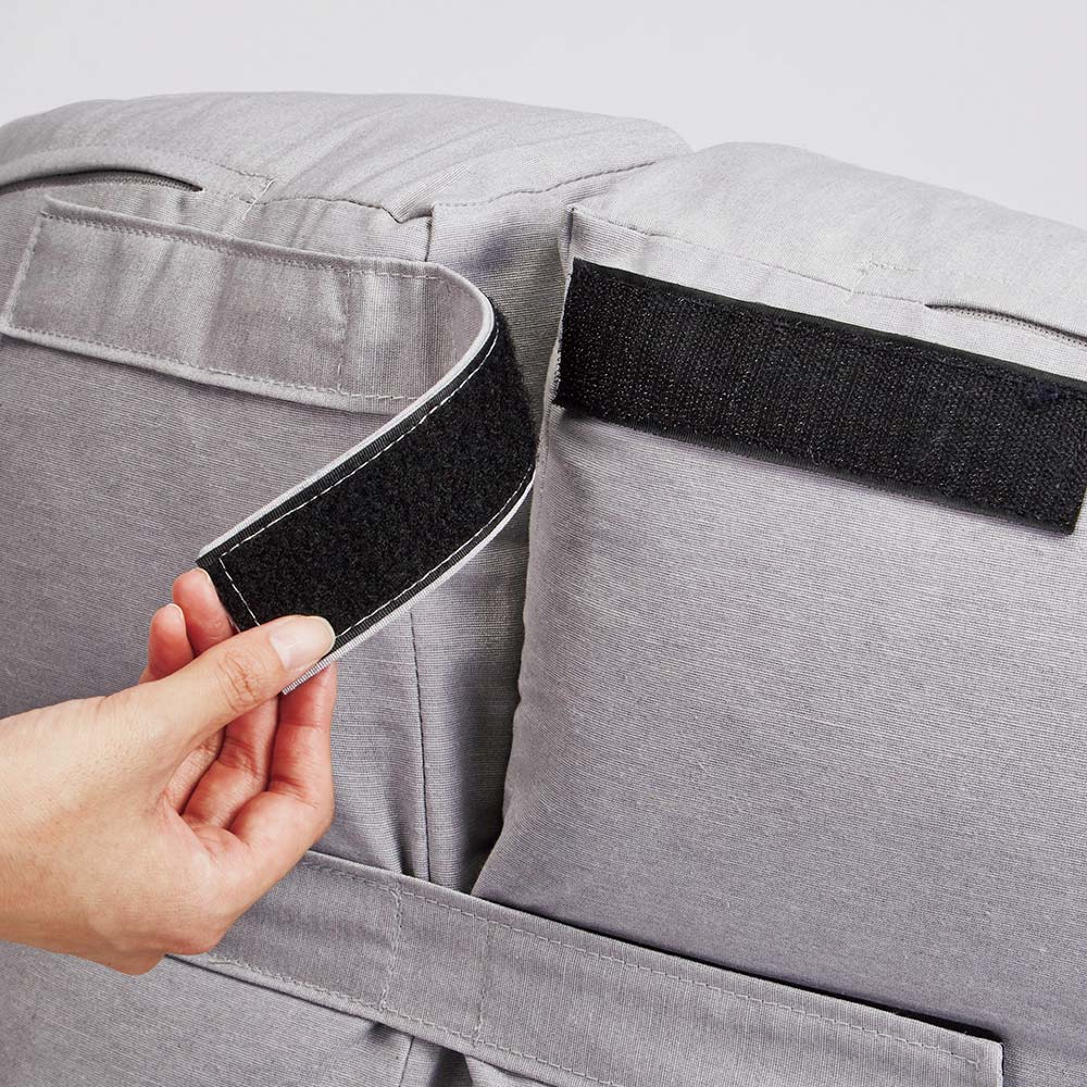 ゆったり包み込まれるような2wayクッション。背中がほどよく支えられ、フラットにすればごろ寝にも。◎背面のマジックテープを外すと半円型のフラットクッションに。
