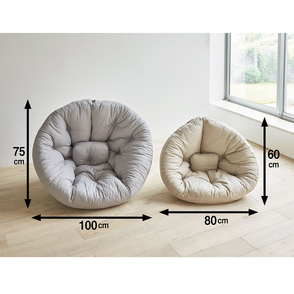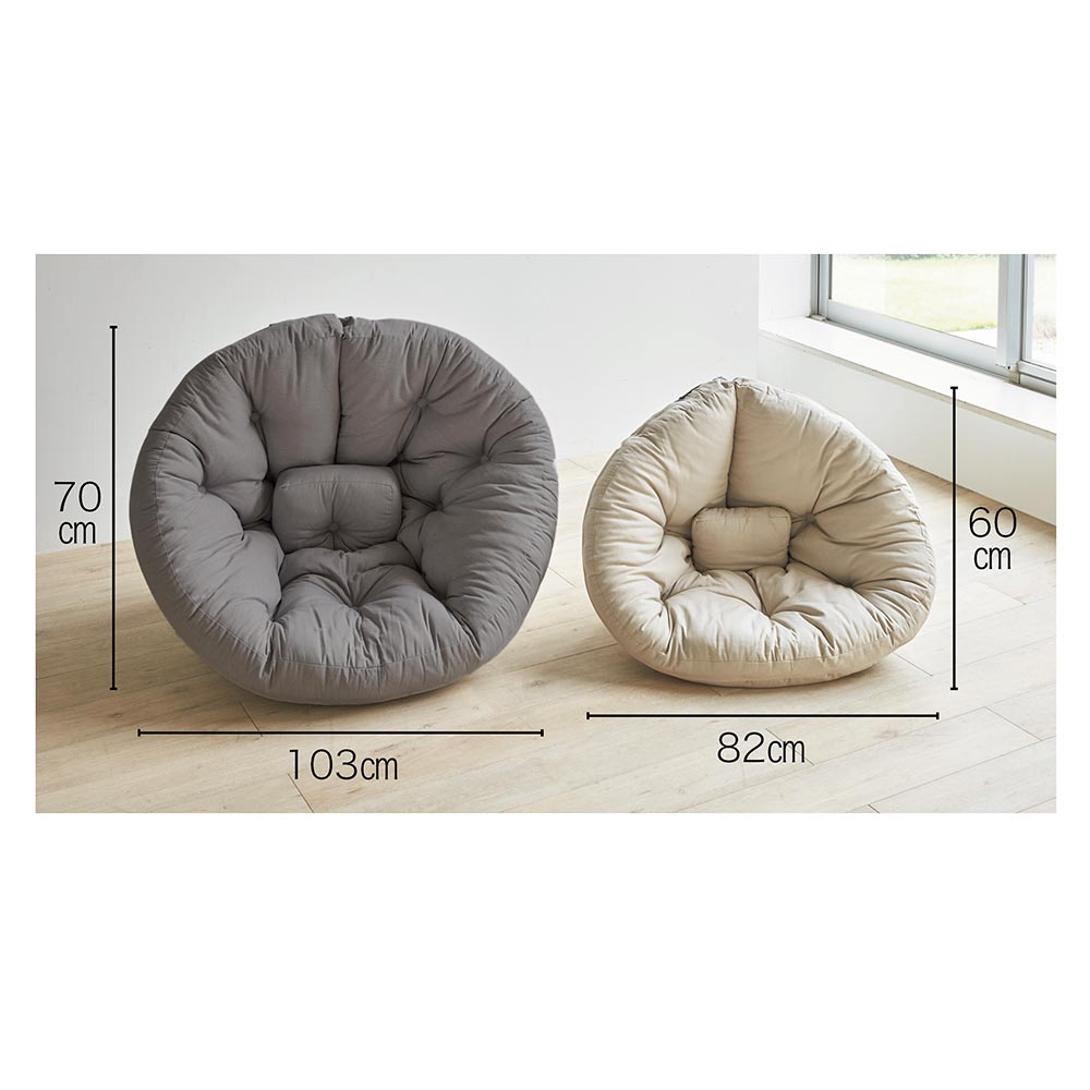 写真は左からフロアチェア(ウ)ライトグレー、フロアチェアMini(ア)ベージュ です。