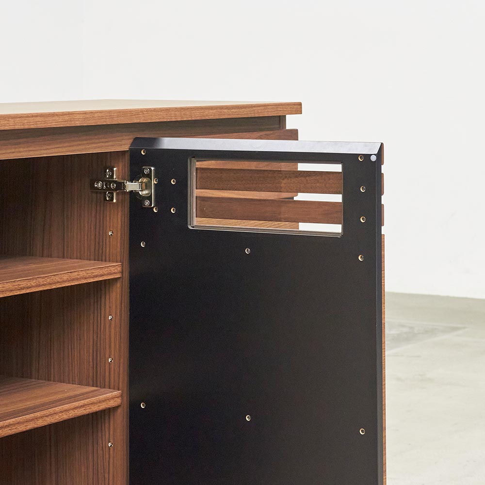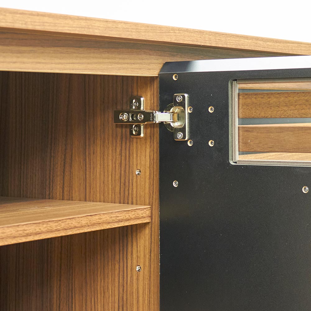 扉・引き出しのスリット部分には3mm厚のガラス窓仕様。閉めたままリモコン操作が可能です。
