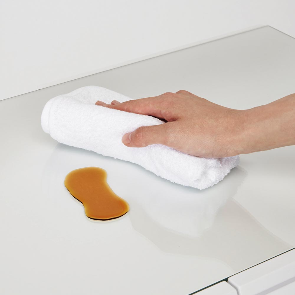 ■天板にはクリアなガラスを乗せてつややかに。■固く絞った付近で水拭きすればあっという間にきれいになってお手入れも簡単。