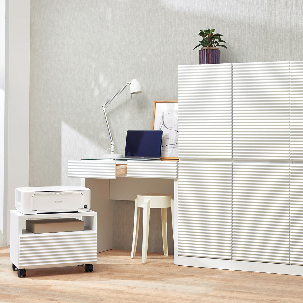 前面に施した立体的なボーダーがリッチなインテリアを叶えるシリーズ。コーディネートしやすいホワイトの家具に丁寧な加工を施すことで、他とは一味違う上質な存在感を放ちます。