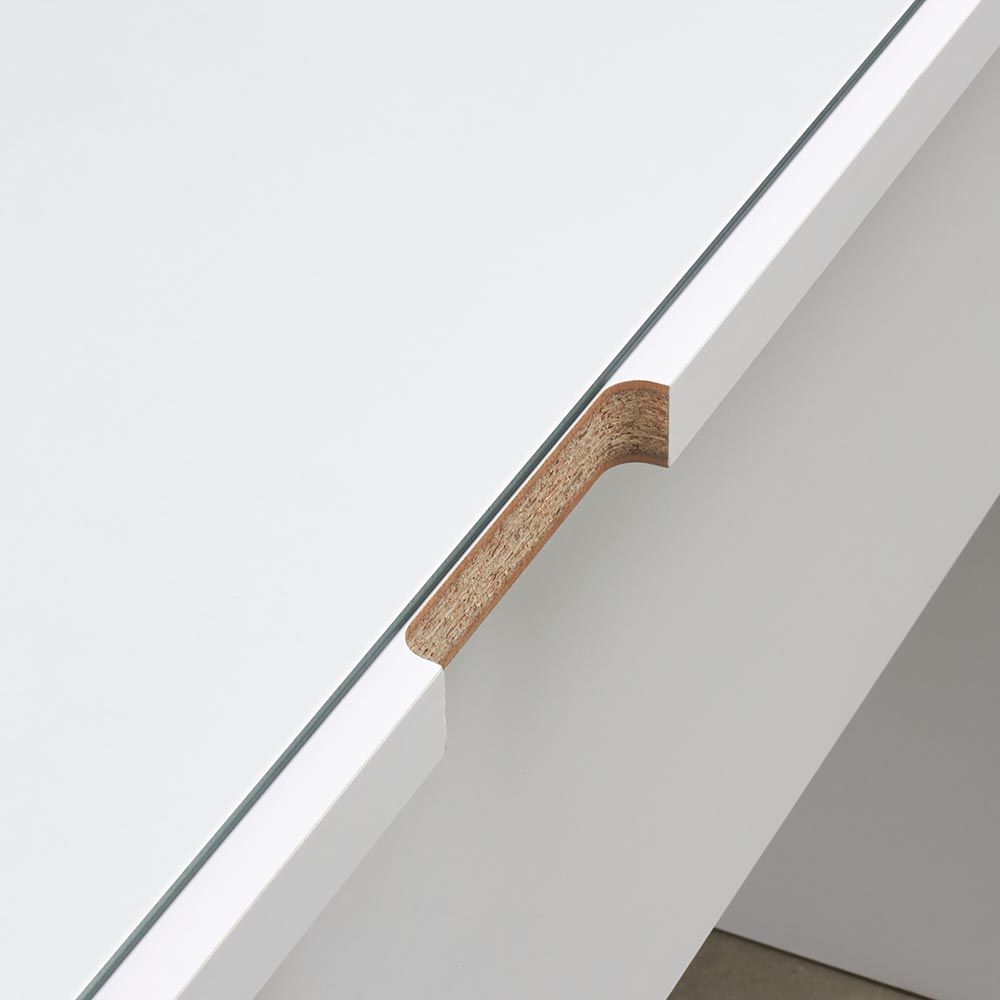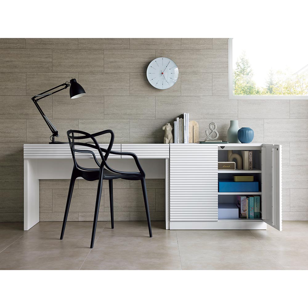 空間に明るさと広がりをもたらす人気のホワイトカラーの家具を、ハウススタイリングがモダンにグレードアップ。前板に施した立体的なボーダーラインが陰影ある表情を魅せる洗練のデザイン。