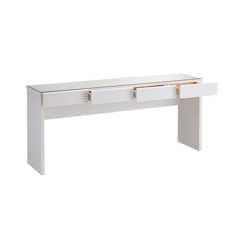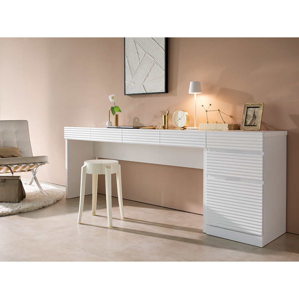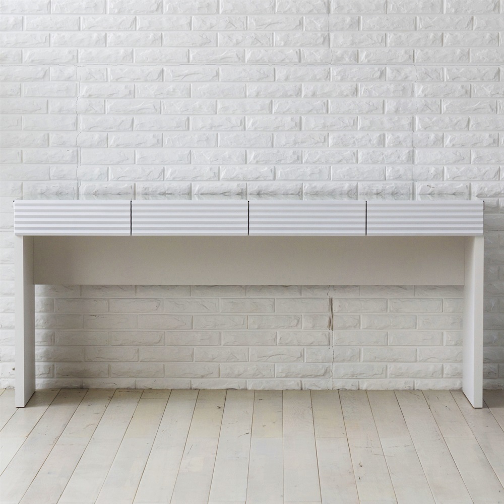 前面に施した立体的なボーダーがリッチなインテリアを叶えるシリーズ。コーディネートしやすいホワイトの家具に丁寧な加工を施すことで、他とは一味違う上質な存在感を放ちます。