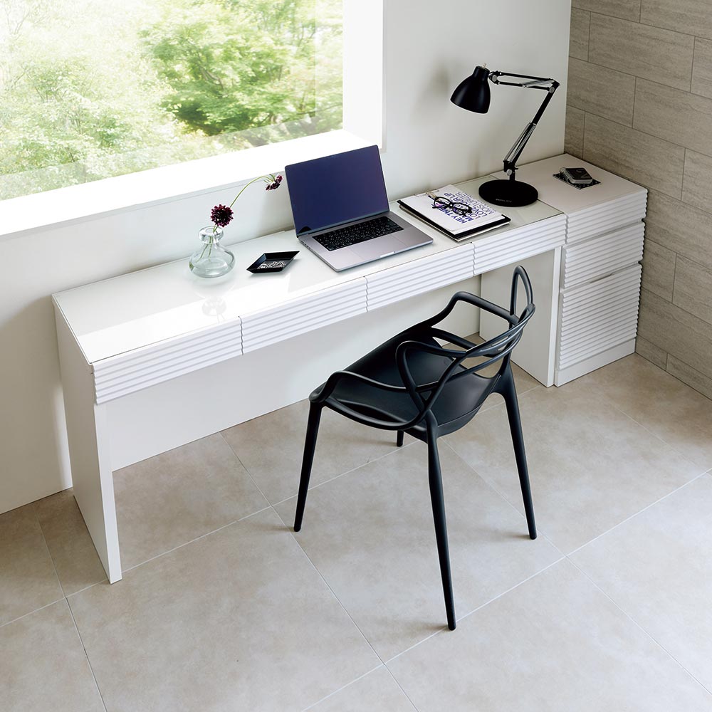 空間に明るさと広がりをもたらす人気のホワイトカラーの家具を、ハウススタイリングがモダンにグレードアップ。前板に施した立体的なボーダーラインが陰影ある表情を魅せる洗練のデザイン。