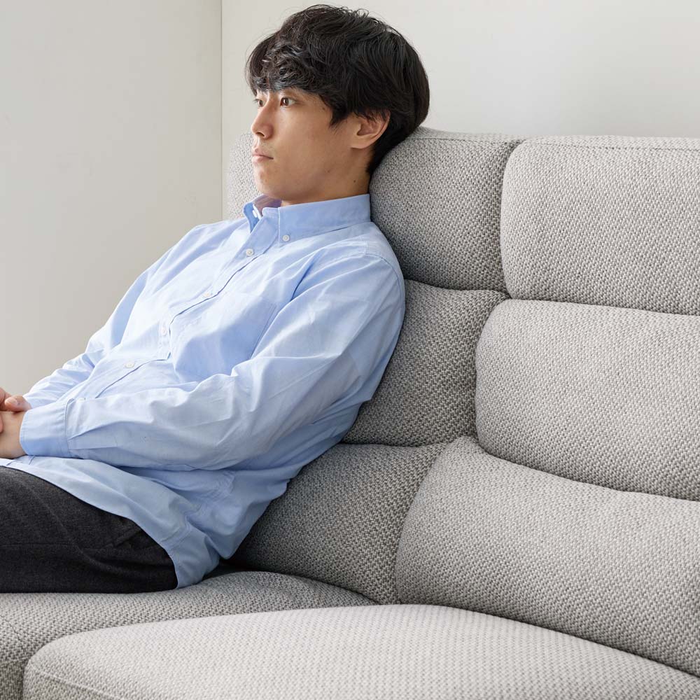 ヘッド部分は無段階で動き、自分の好みの角度に合わせることができます。スムーズな動きで誰でも簡単に調整可能。ヘッドレストソファはデザインが野暮ったくなりがちですが、壁付けはもちろん、リビングの中央に置いたときにも違和感のないすっきりとしたデザインを意識しました。【ポイント2】体をしっかり支える座り心地