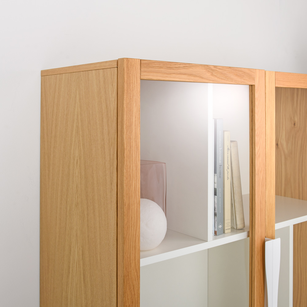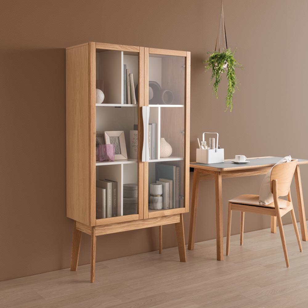 オーク天然木を贅沢に使用したフレームにオイル仕上げを施した美しい木目。4mm厚の強化ガラスがモダンな印象を添え、インテリアを格調高く演出します。