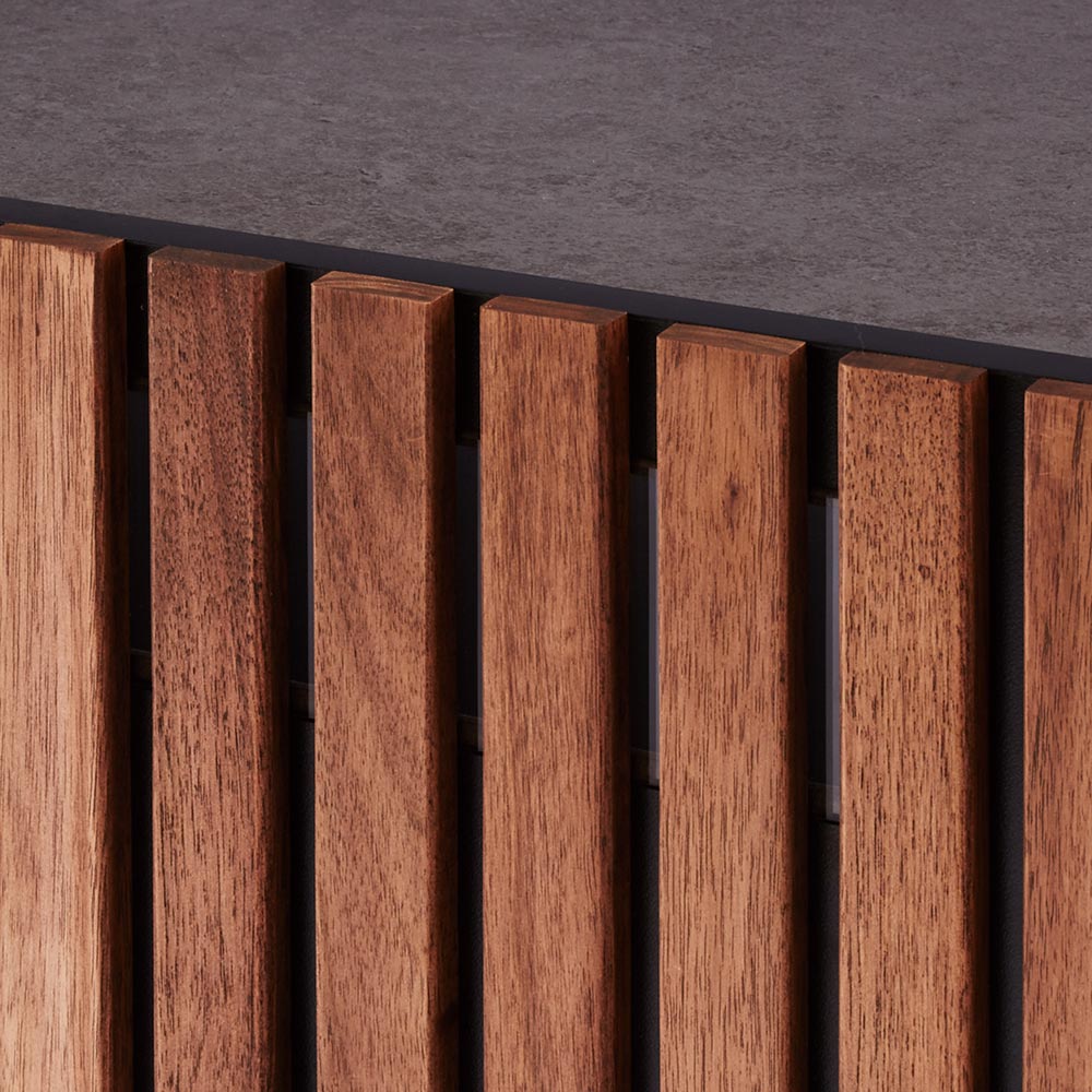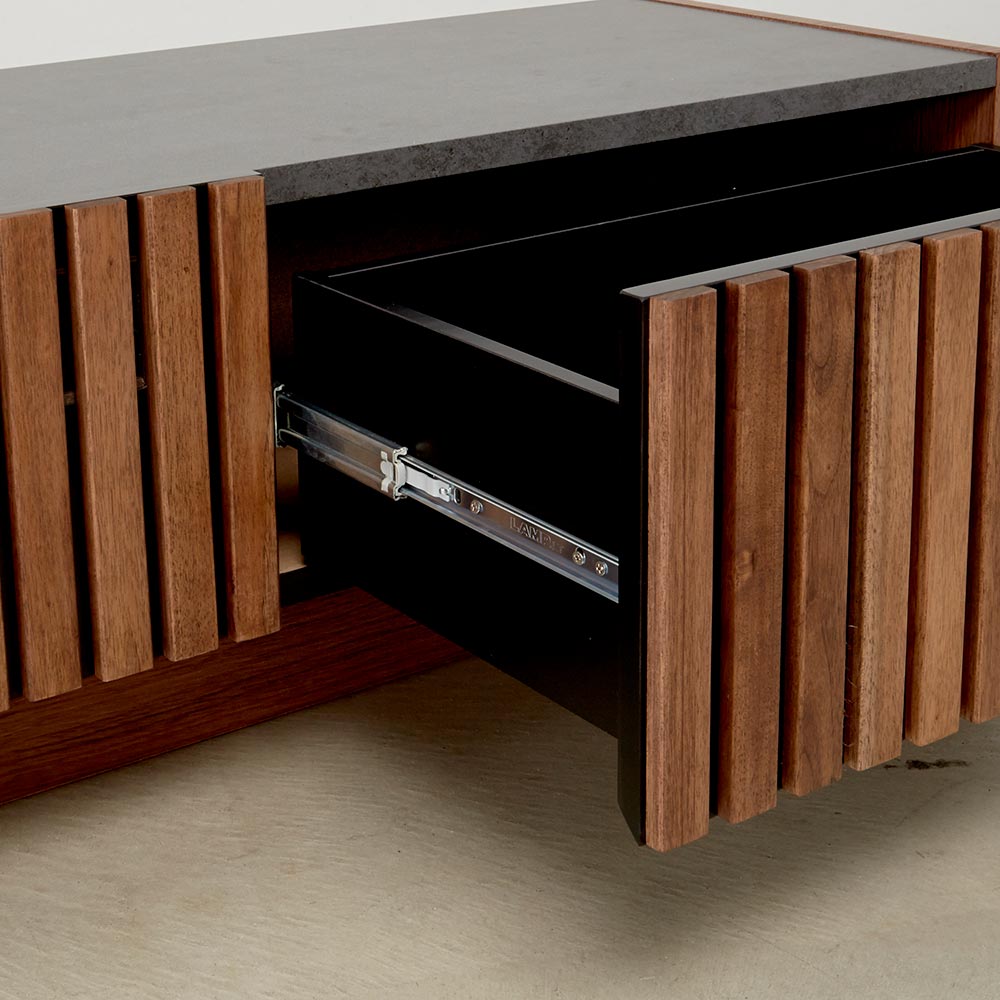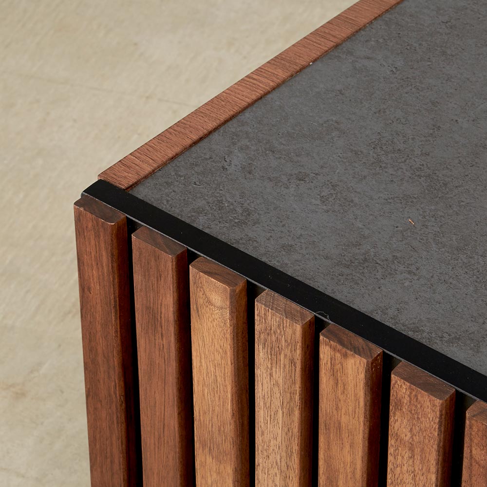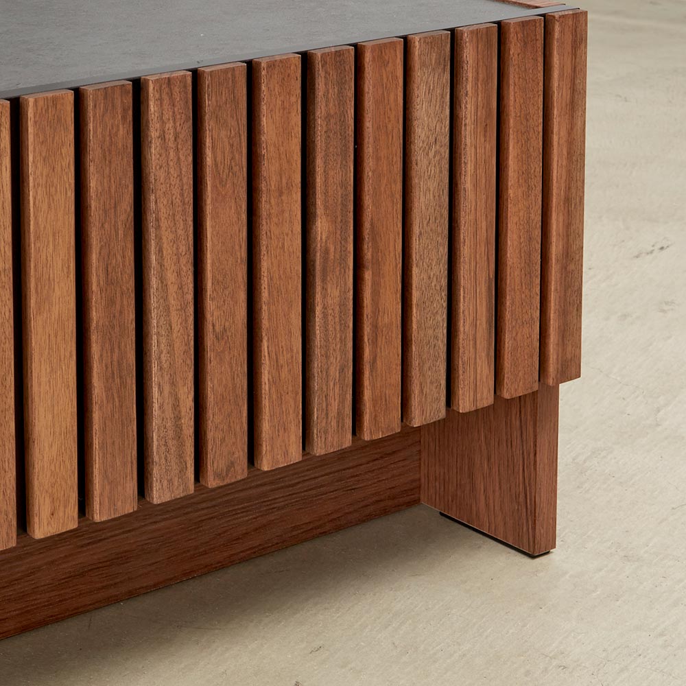 天然クルミ材を細やかなスリット状に配した前面デザイン。落ち着きのあるセラミック柄の天板との調和でモダンリビング。