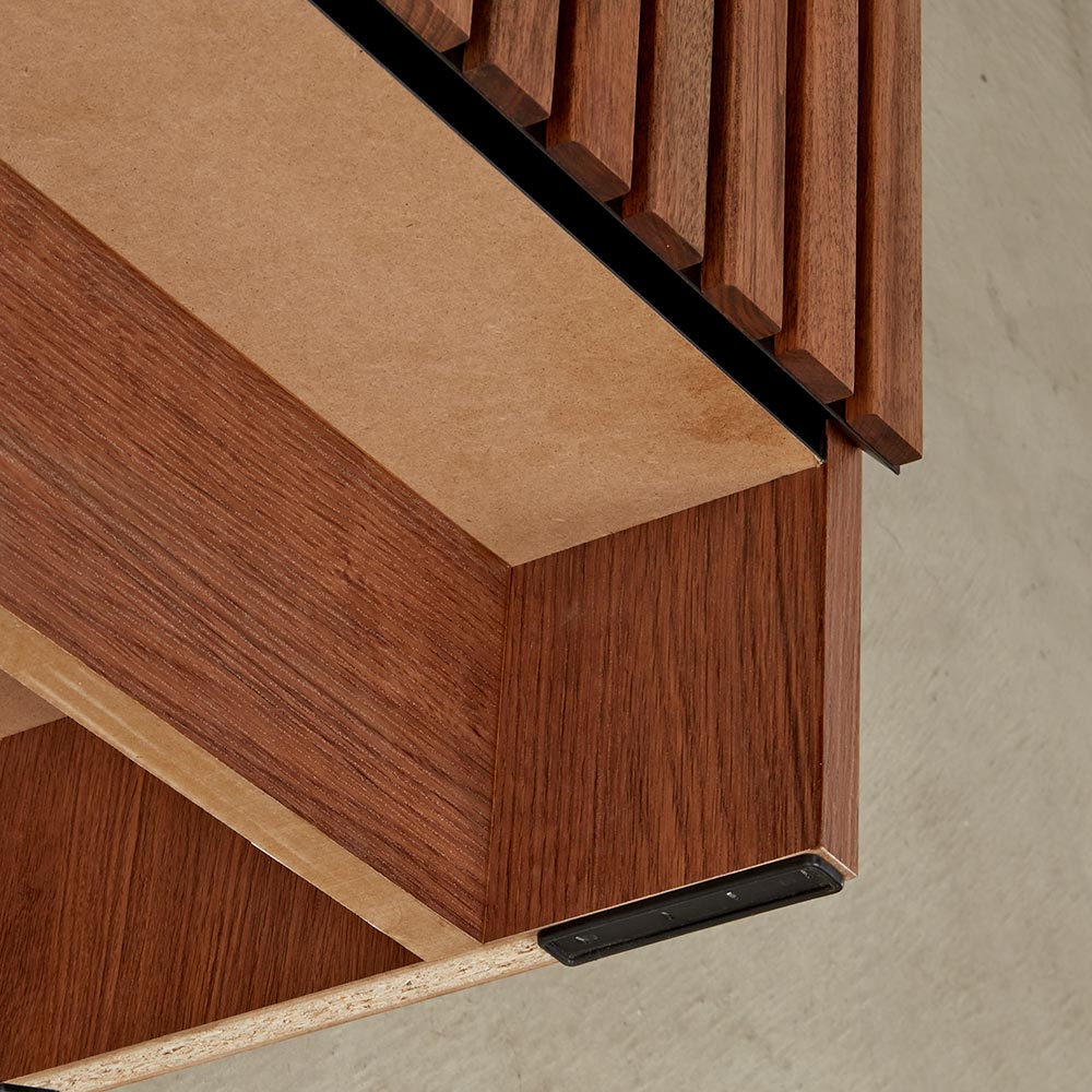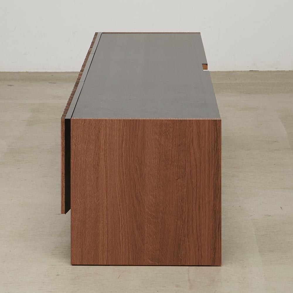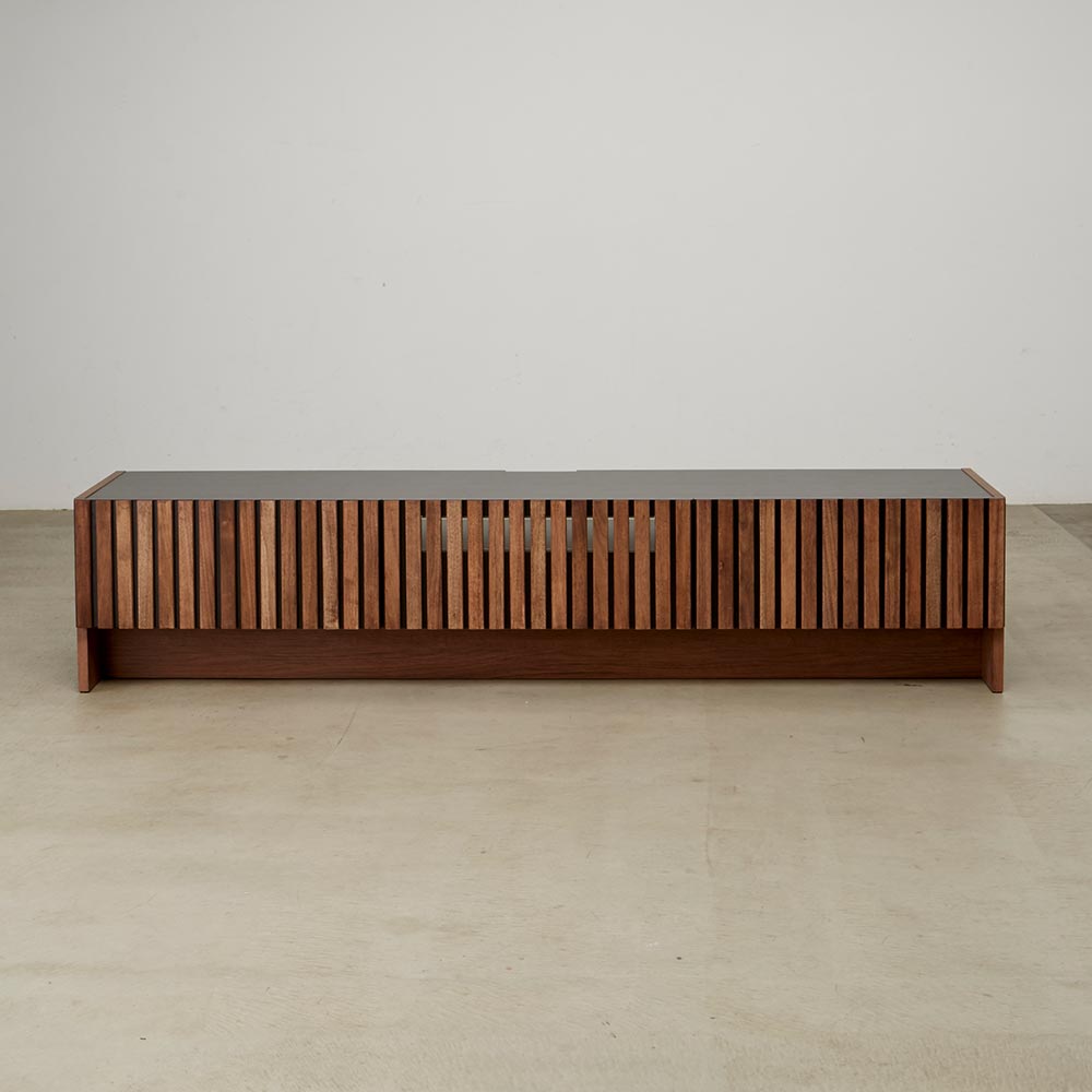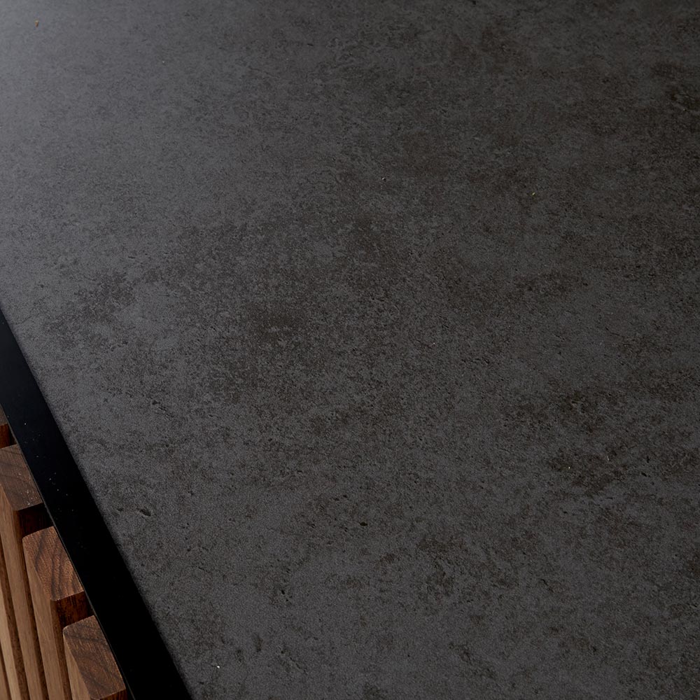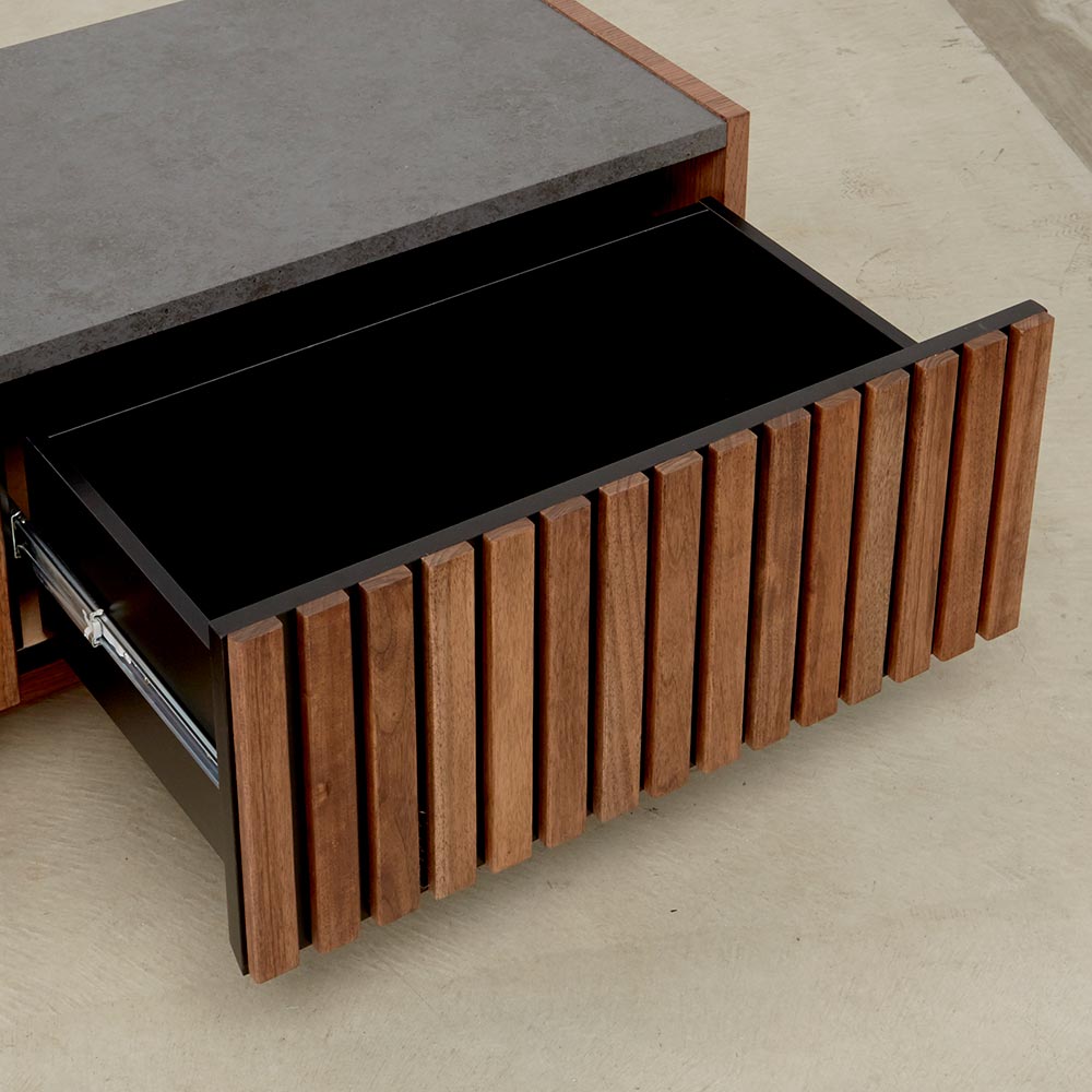 天然クルミ材を細やかなスリット状に配した前面デザイン。落ち着きのあるセラミック柄の天板との調和でモダンリビング。