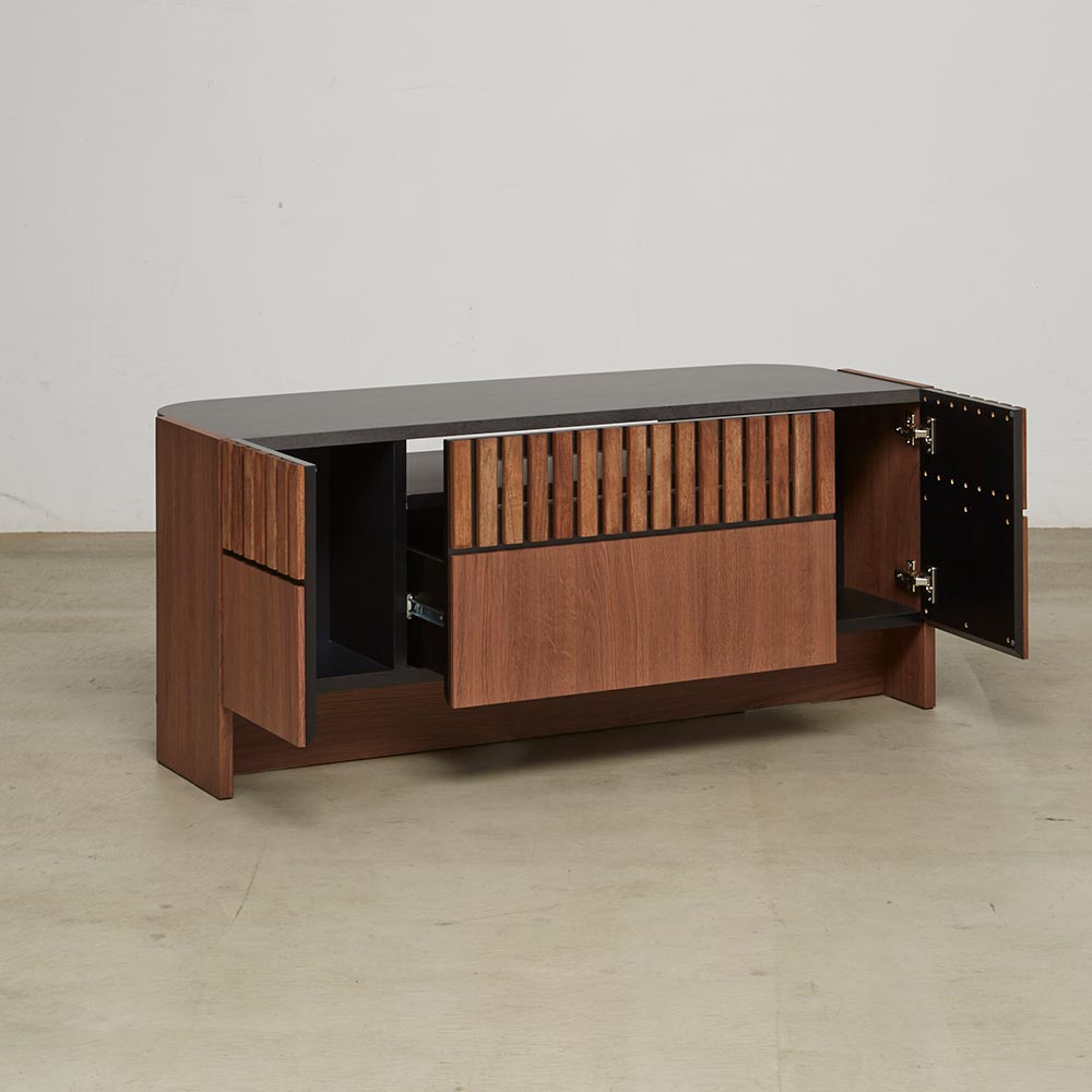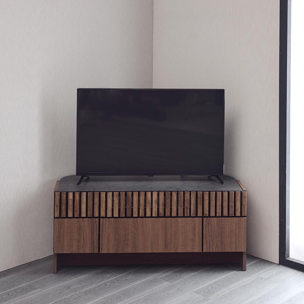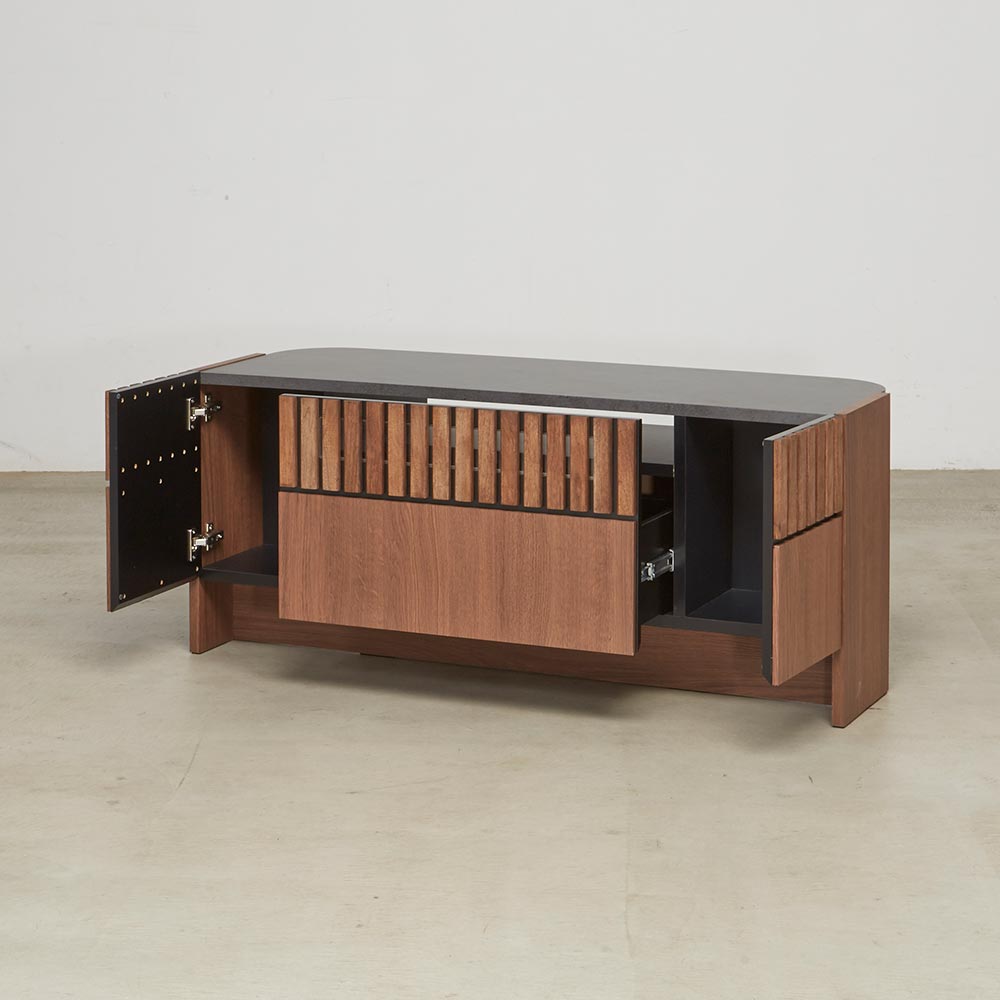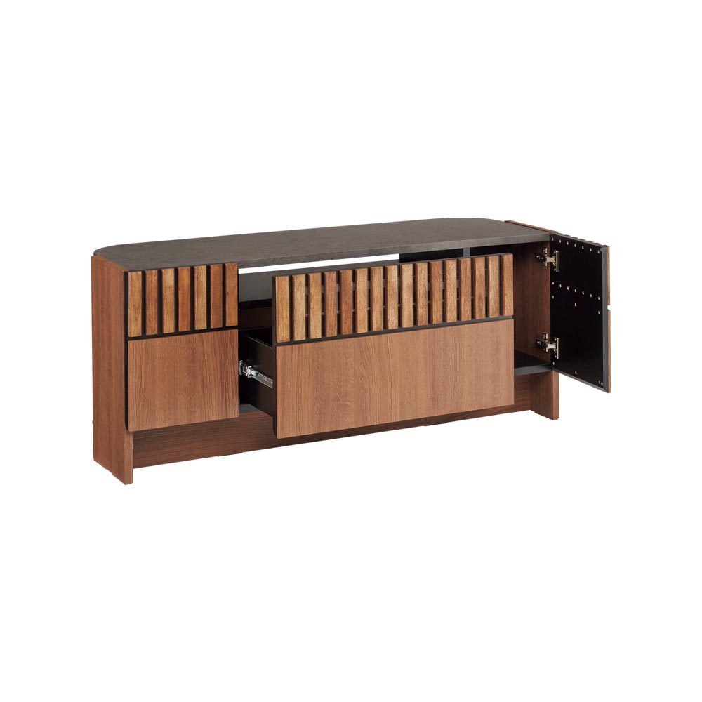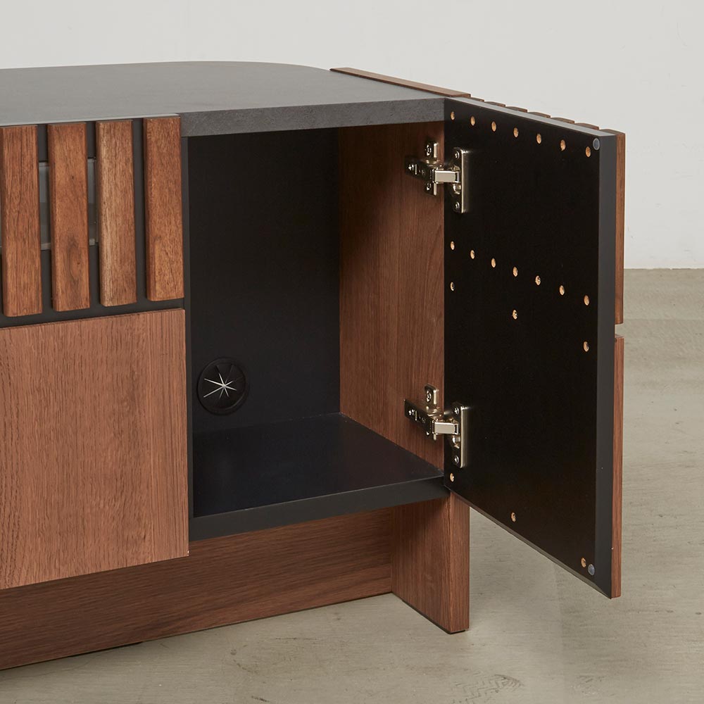天然クルミ材を細やかなスリット状に配した前面デザイン。落ち着きのあるセラミック柄の天板との調和でモダンリビング。