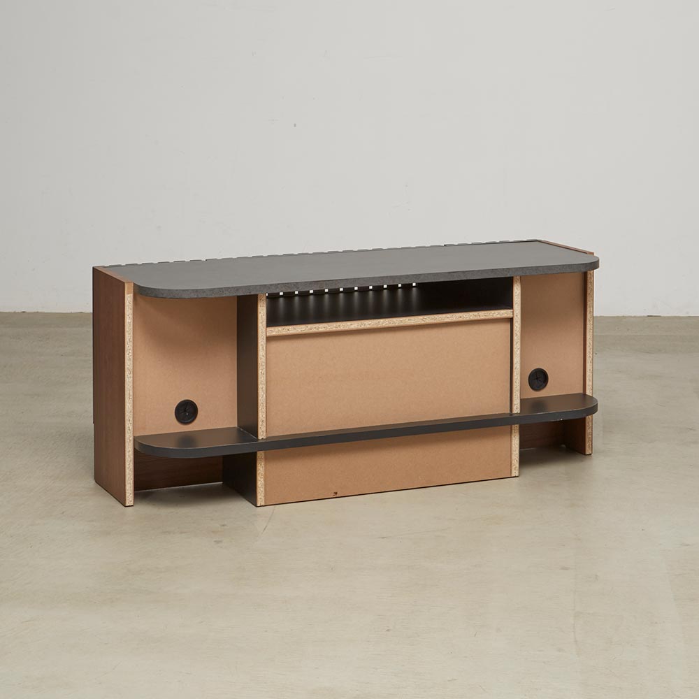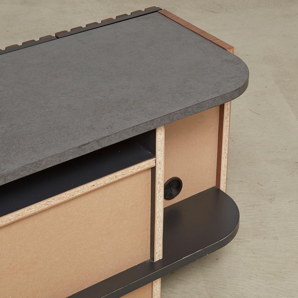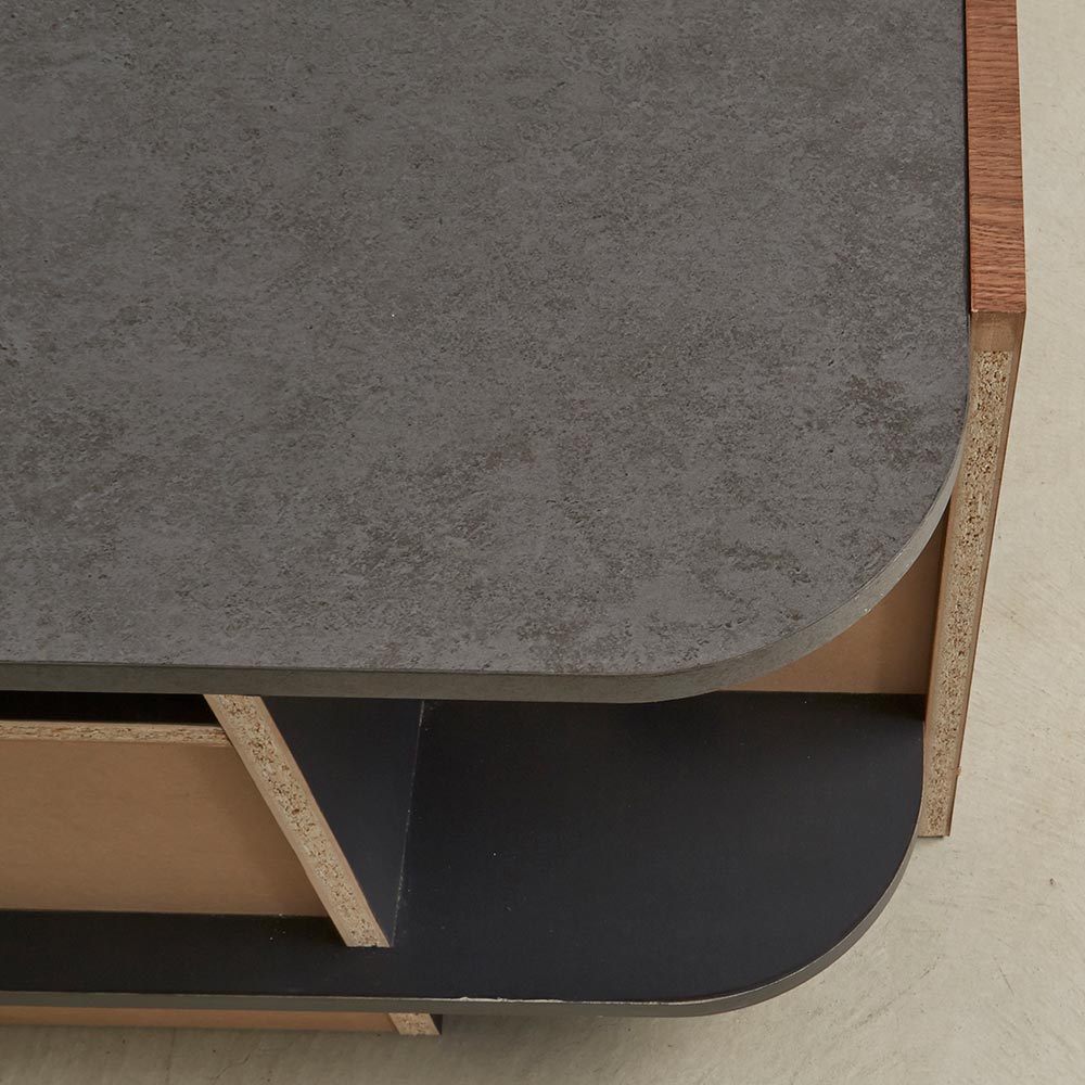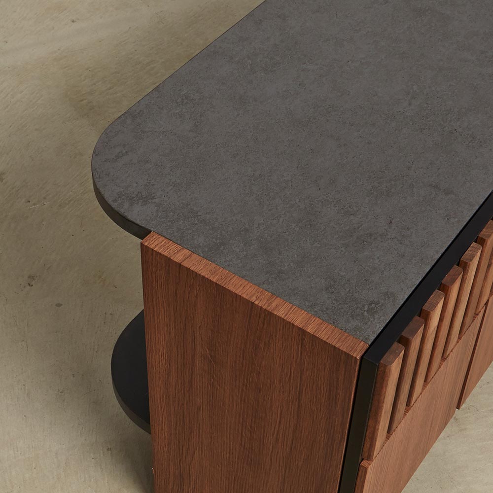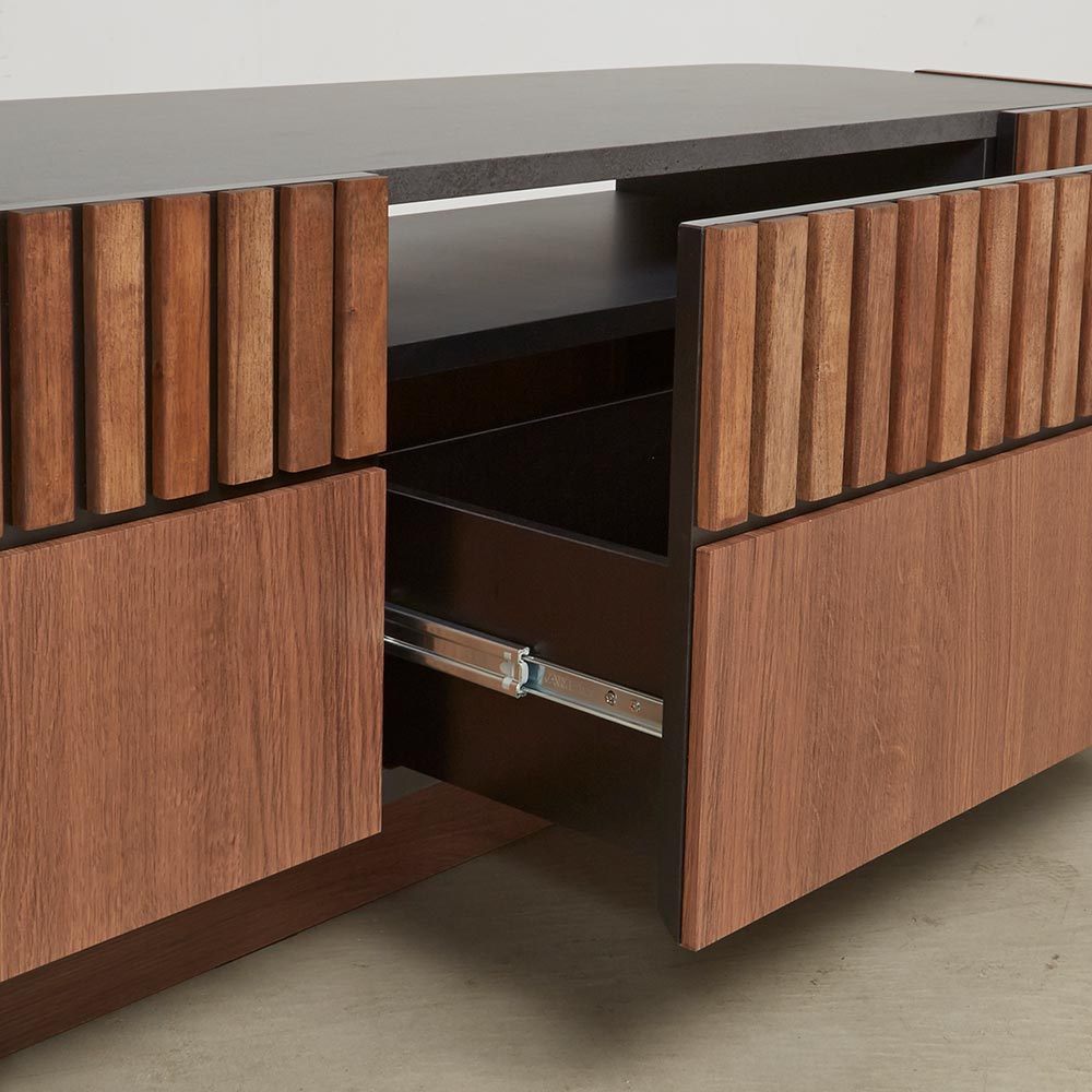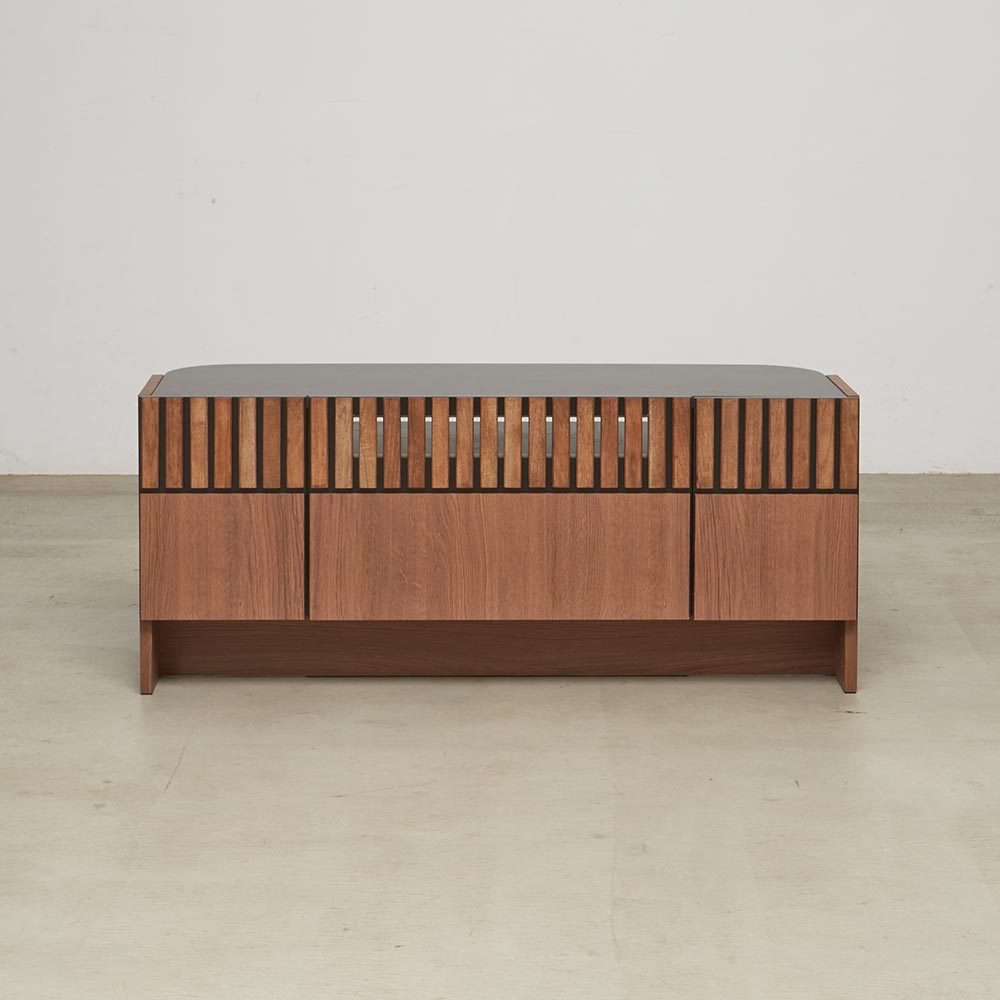 天然クルミ材を細やかなスリット状に配した前面デザイン。落ち着きのあるセラミック柄の天板との調和でモダンリビング。