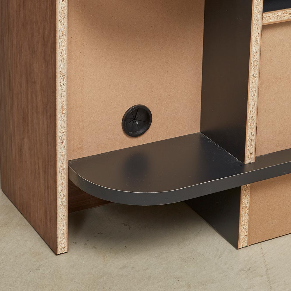 中央部には、AV機器収納スペースと便利な引き出し収納を上下に配置。左右の扉収納部にはルーターなどの機器を収納でき、背面のコード穴で配線もすっきり。