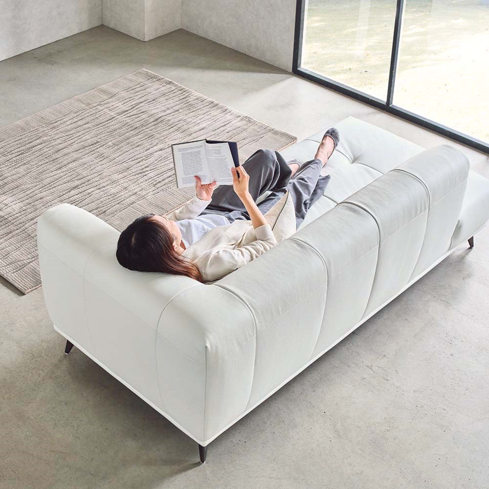 どこか懐かしさを感じさせるレザー×キルティング加工。片側の肘掛けがないので空間を広く見せる効果も。本革ソファは、時を重ねるほどに味わい深い風合いが増し、上質な空間を演出する特別なソファです。しっとりとした肌触りと座り心地の良さは、日常にくつろぎをもたらし、使うほどに愛着が深まります。シンプルながらも存在感があり、リビングを格調高く彩る本革ソファ。耐久性にも優れ、長く寄り添う一生もののアイテムとしておすすめです。