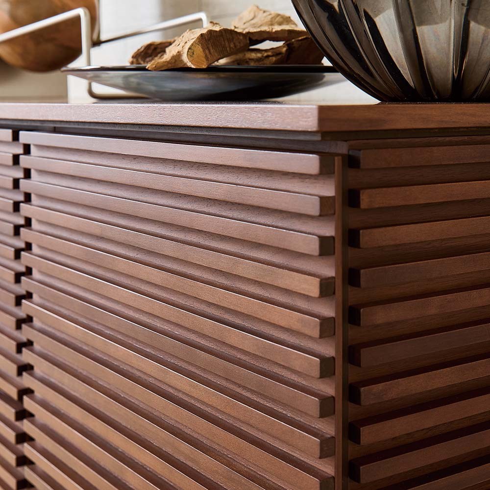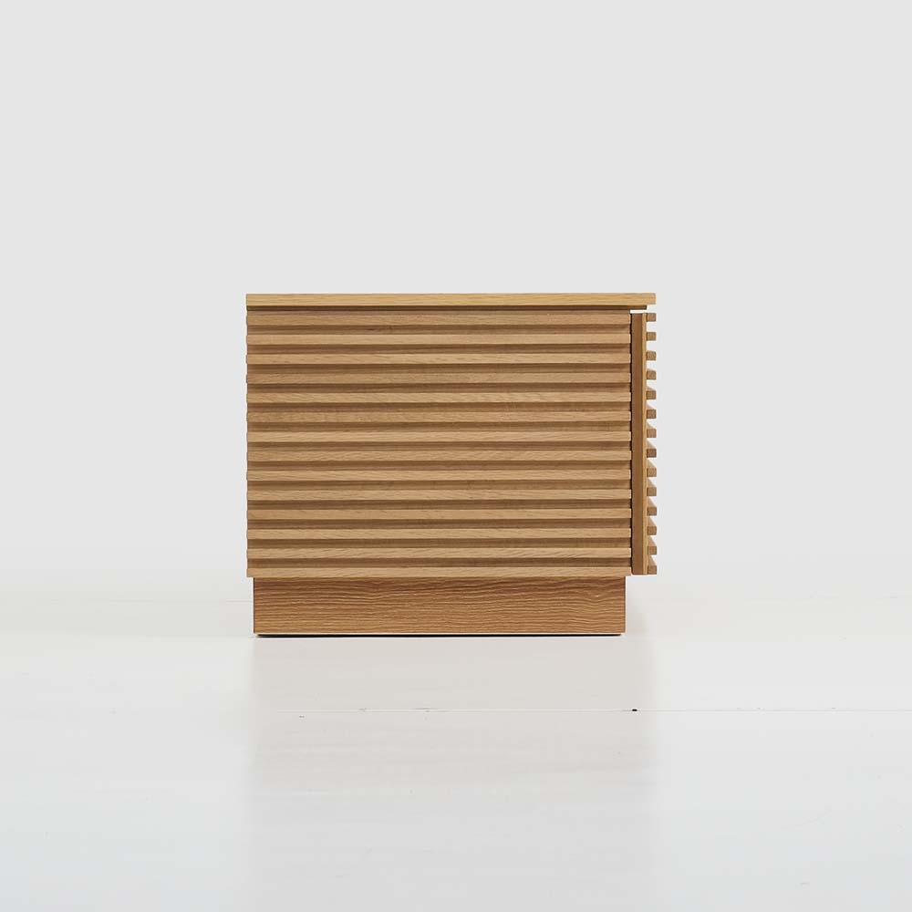 扉だけでなくサイドにも天然木の横格子をあしらった贅沢なデザイン。横目を丁寧に揃える高度な職人技で、どの角度から見ても美しい仕上がりを実現しました。