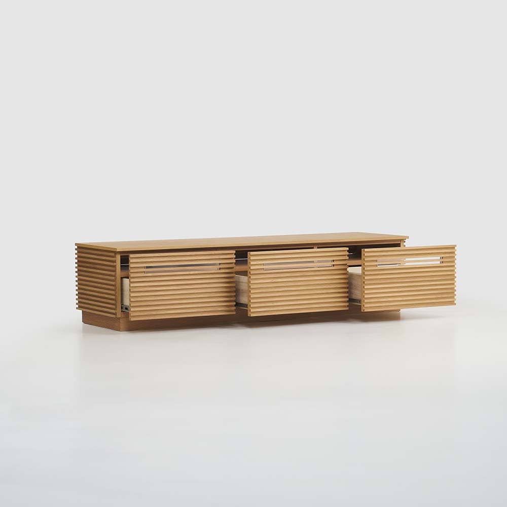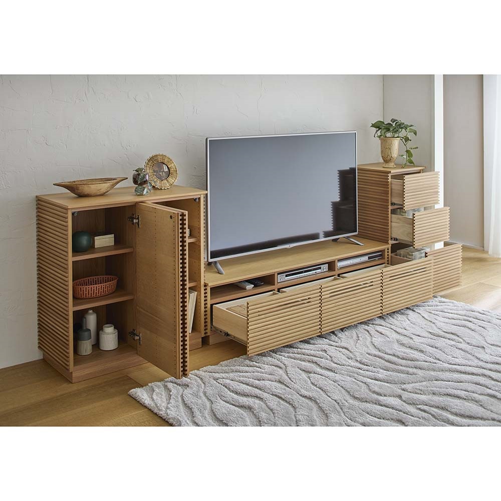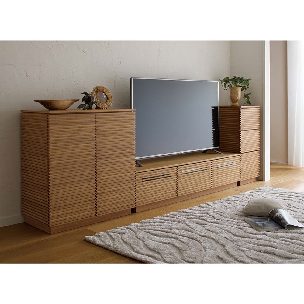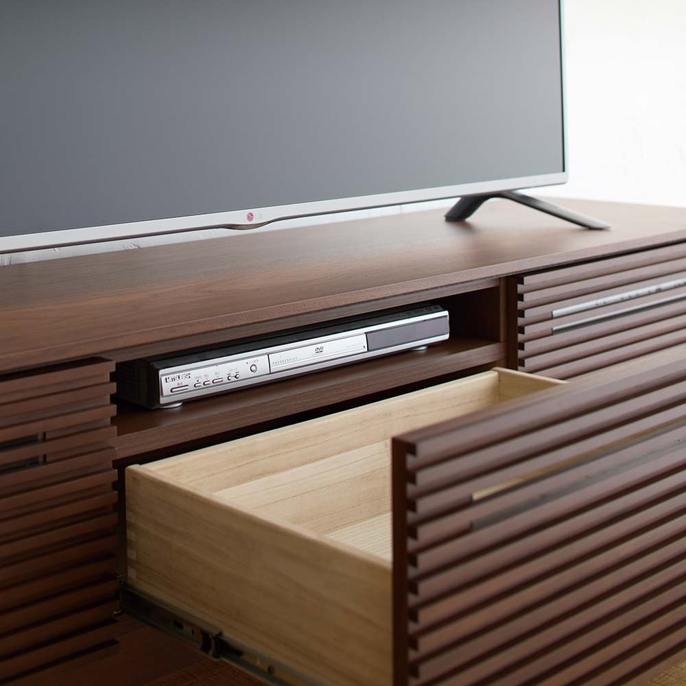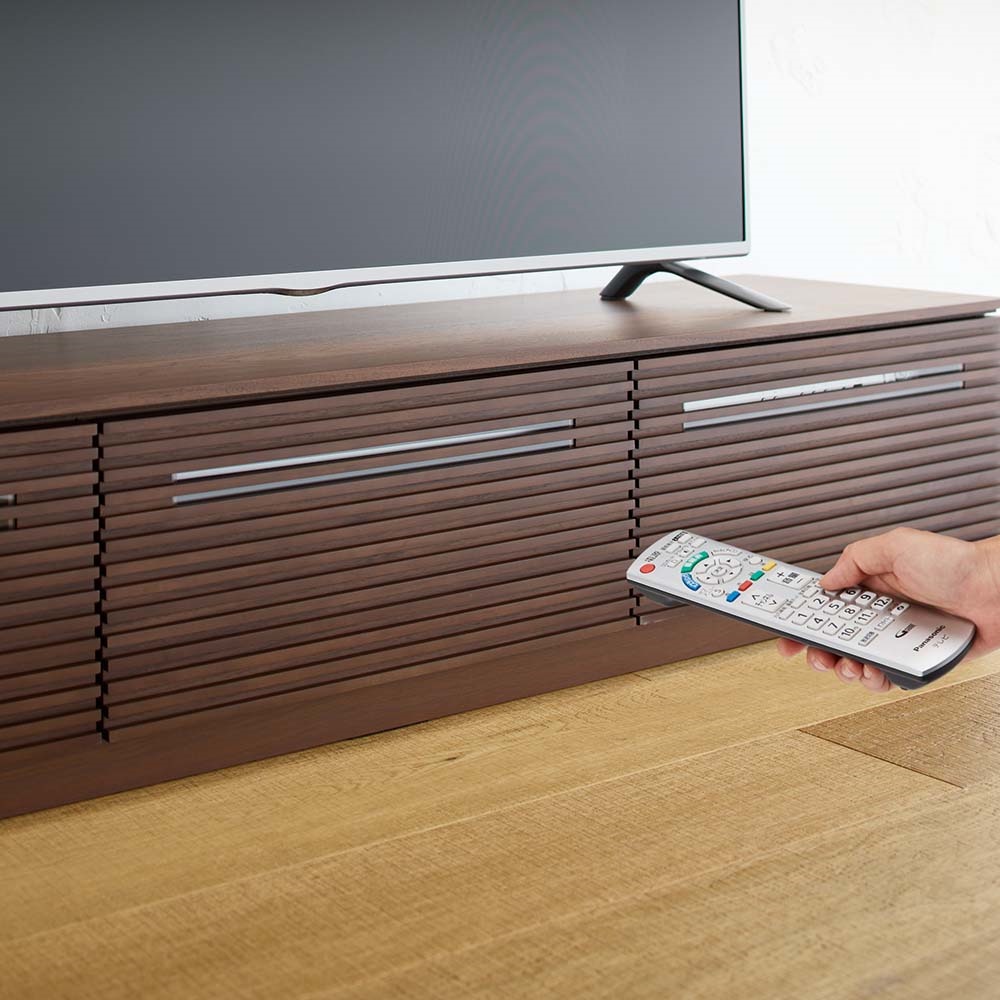・天然木突板を使った横格子デザインで前面・側面どちらから見ても美しい・テレビ台は格子のすき間から赤外線が通せる仕様なので、デッキを収納したままリモコン操作が出来ます。