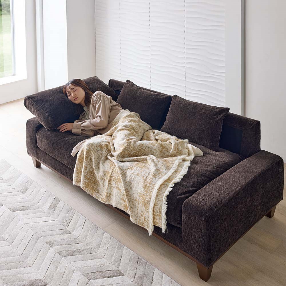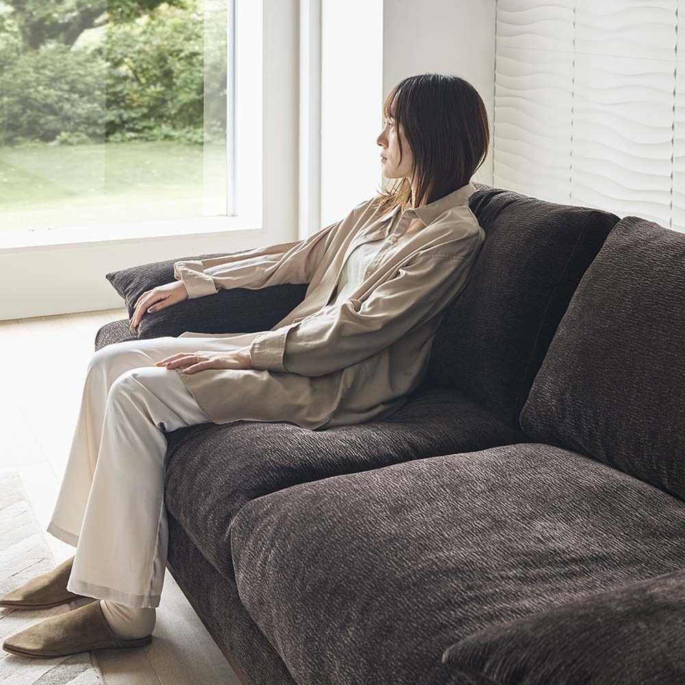 座ると、ふわっととろけるような感覚に。身体を預けると、まるで雲の上にいるような心地よさ…。ため息が漏れるほどの贅沢な座り心地の秘密は、中材にたっぷりと使用したフェザー。広々とした背もたれ、枕代わりにもなるアームクッションで、心ほどけるひとときへ誘います。
