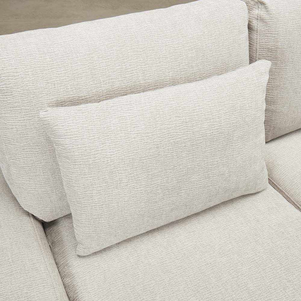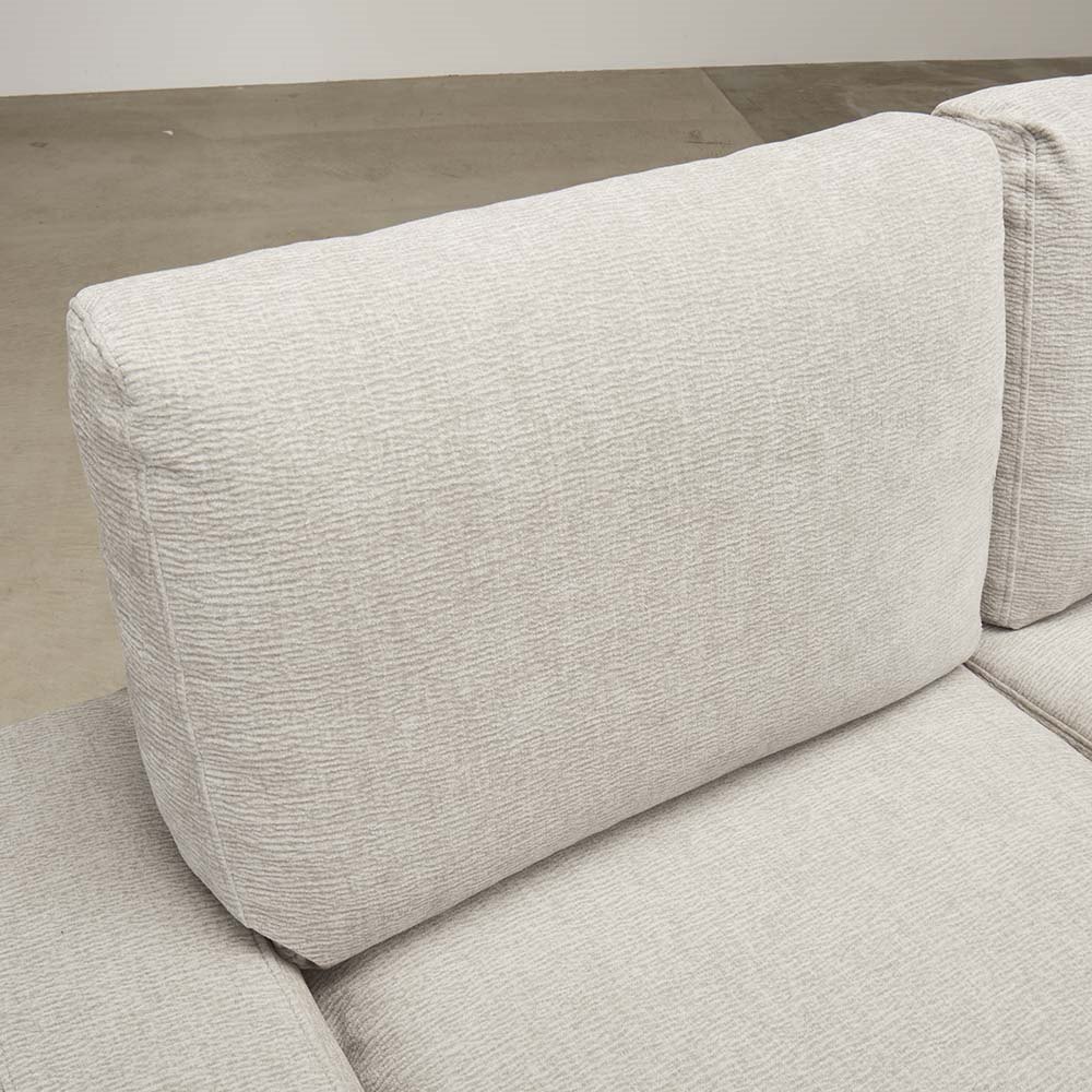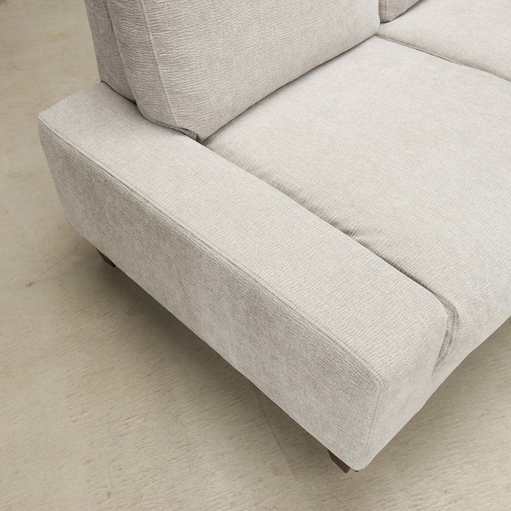 表面に使われている生地も通常の生地ではなく、柔らかさを感じられる様にランク上位の生地を採用。コーデュロイのような手触りで、通常の生地よりも凹凸感のある生地です。ソファの見た目の表情を立体的に感じさせるだけではなく、クッションの中身のフェザーやウレタンまでしっかりと優しく包み込むような感触を与えてくれます。