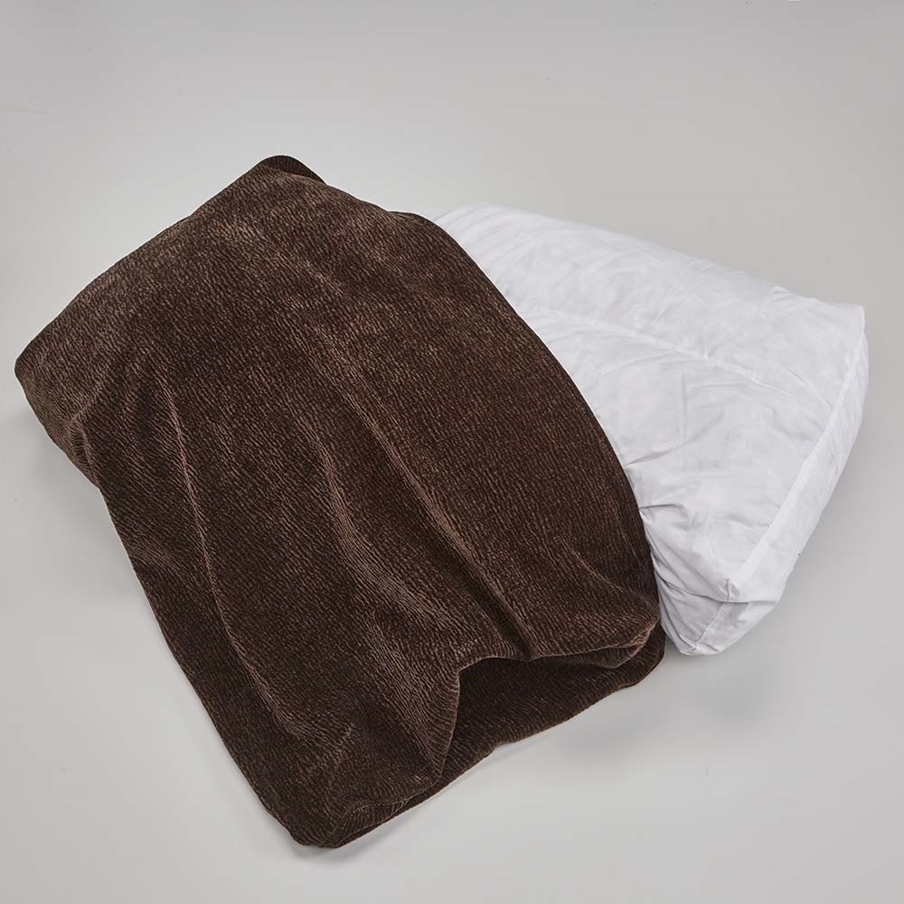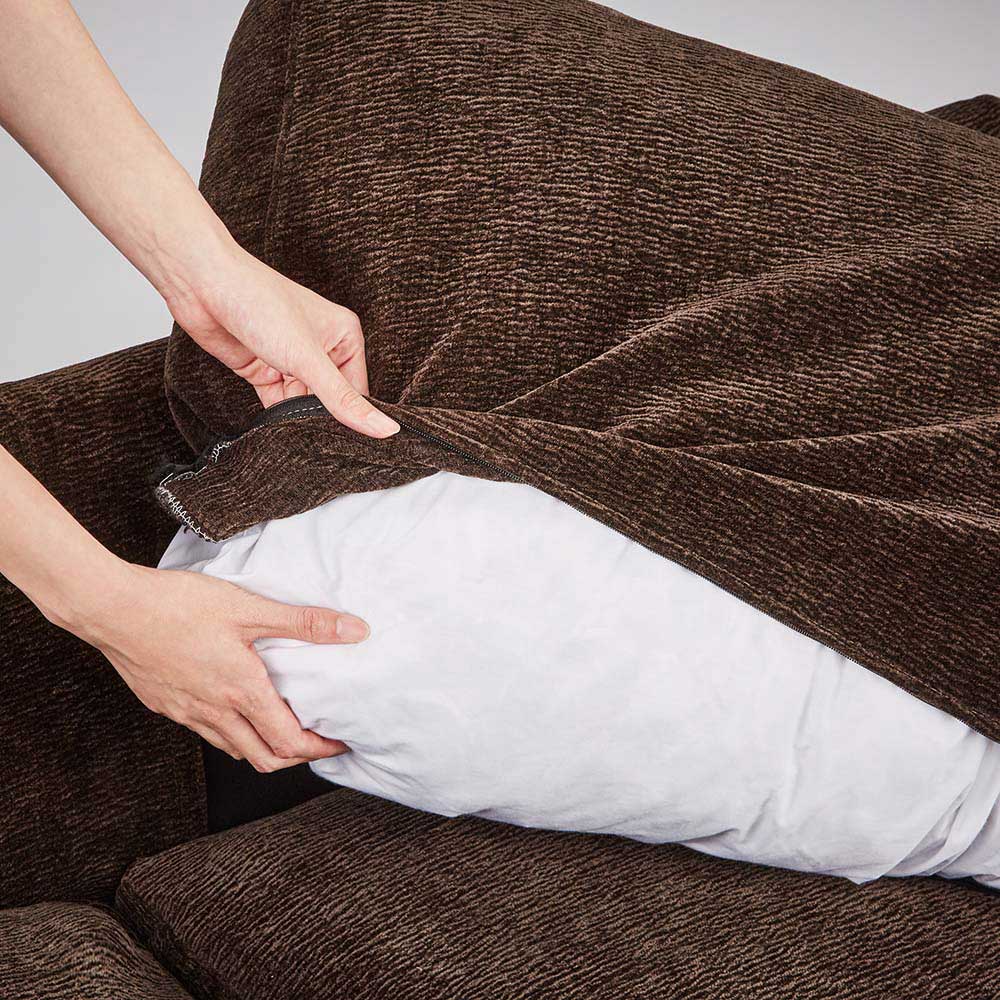 表面に使われている生地も通常の生地ではなく、柔らかさを感じられる様にランク上位の生地を採用。コーデュロイのような手触りで、通常の生地よりも凹凸感のある生地です。ソファの見た目の表情を立体的に感じさせるだけではなく、クッションの中身のフェザーやウレタンまでしっかりと優しく包み込むような感触を与えてくれます。日頃のお手入れを考えたカバーリング仕様
