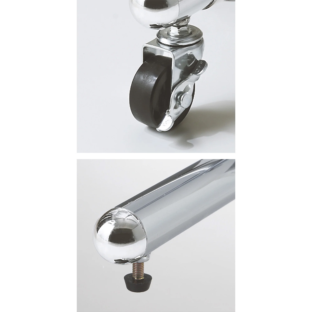 (写真上)全荷重をしっかりと支えるキャスターも頑丈仕様です。 洋服を掛けても移動がラクラクできます。(写真下)アジャスターも付属しています。高さは約1.5cm調節が可能です。