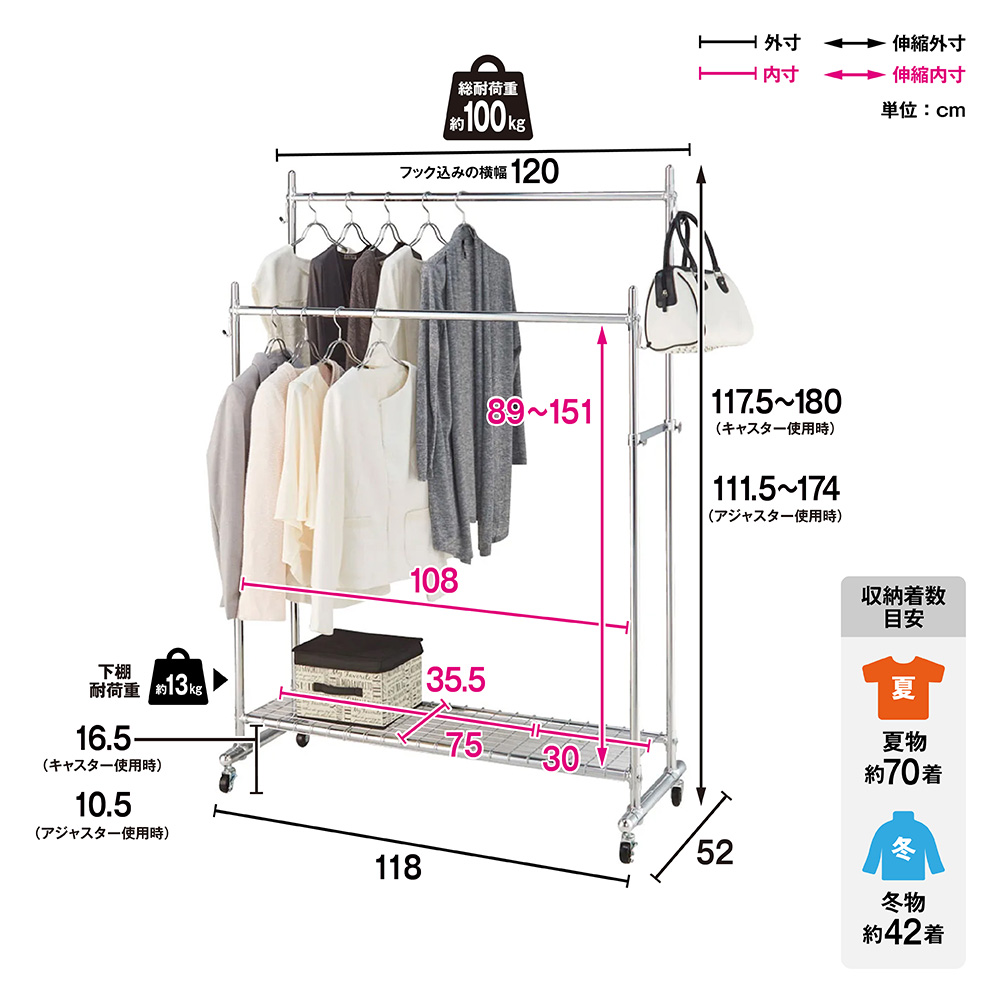 ●ハンガーバーの高さは収納するものに応じて「117.5~180cm」に調節が可能です。●バッグ、ベルトやストールが掛けられるサイドフック付きです。