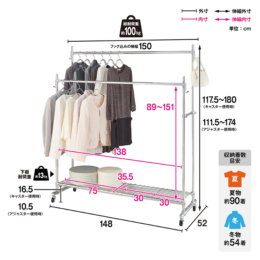 【詳細サイズ】 ※衣類の収納目安は、衣類をハンガーに掛けた際の厚さを夏物約3cm、冬物約5cmで算出。
