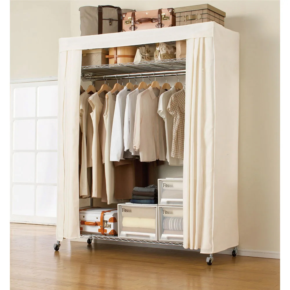 使用イメージ(ア)パイプ色シルバー 前面のカーテンを閉めれば、ホコリや日焼けから衣類を守ります。突然のお客様でも安心で見た目もすっきりします。 ※写真は別売りのロータイプ幅152cmです。