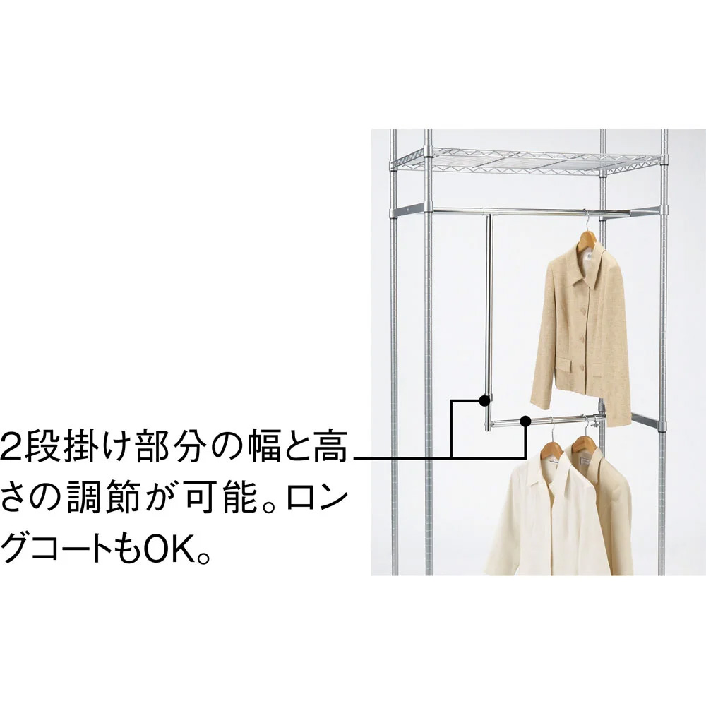 (ア)パイプ色シルバー 上下2段掛けタイプはロング丈のコートと丈の短いジャケット、パンツをバランスよく収納できます。2段掛けハンガー部は高さと幅が調節できます。 ※写真はお届けする商品です。