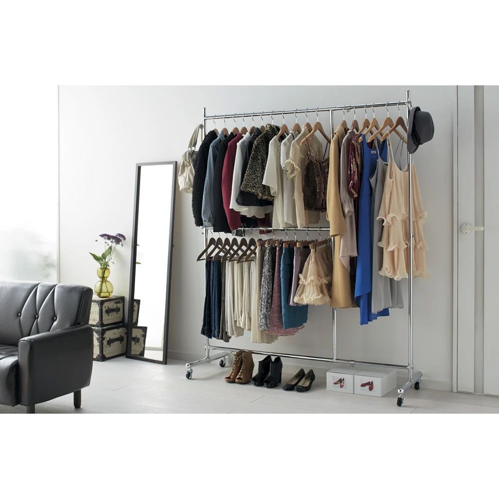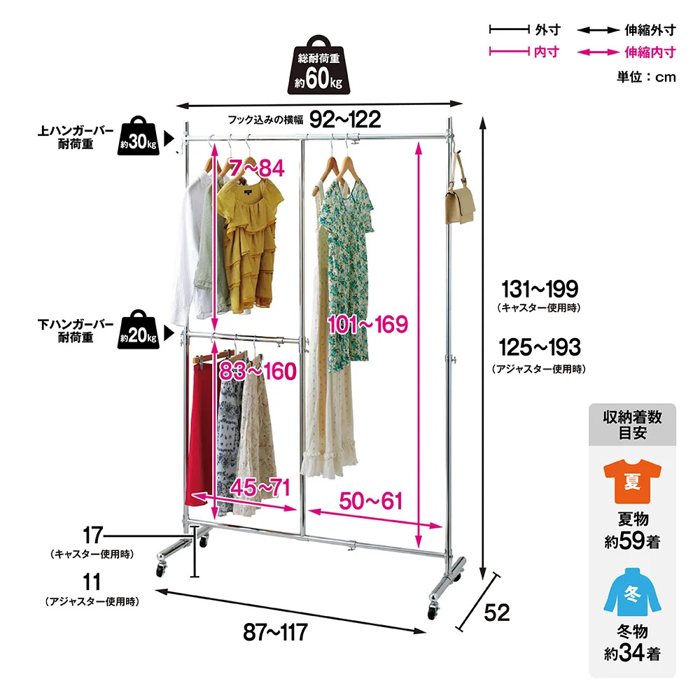 ●本体の幅・高さが伸縮します。設置場所に合わせて無駄なく置くことができます。●2段掛けバー付きなので、ジャケットやパンツ、スカートも効率よく収納可能です。