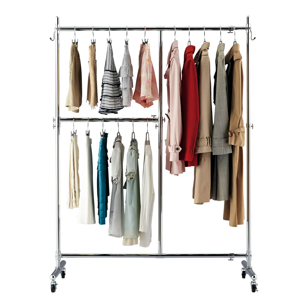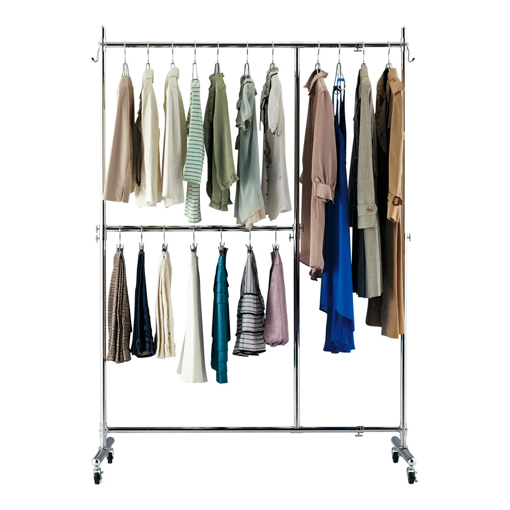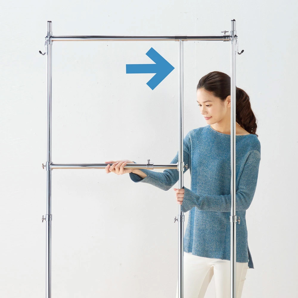 ●本体の幅・高さが伸縮します。設置場所に合わせて無駄なく置くことができます。●2段掛けバー付きなので、ジャケットやパンツ、スカートも効率よく収納可能です。