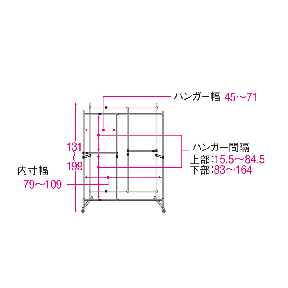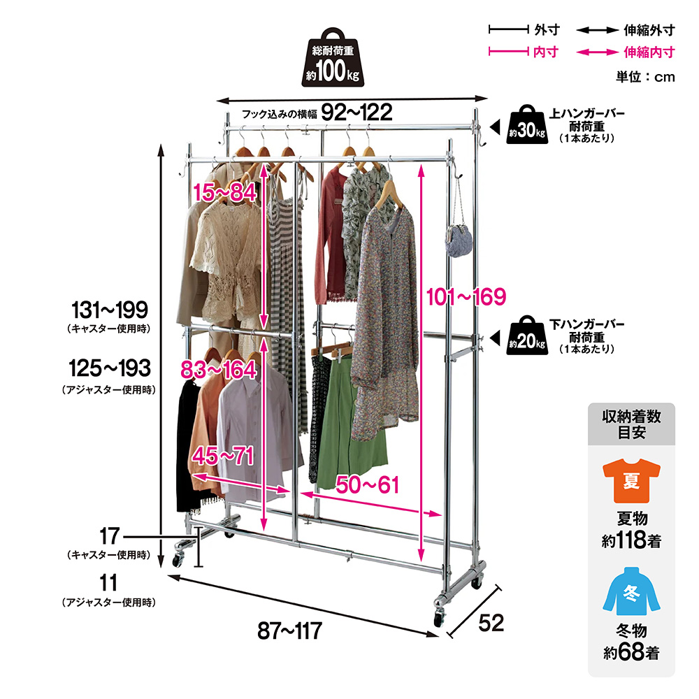●本体の幅・高さが伸縮します。設置場所に合わせて無駄なく置くことができます。●2段掛けバー付きなので、ジャケットやパンツ、スカートも効率よく収納可能です。