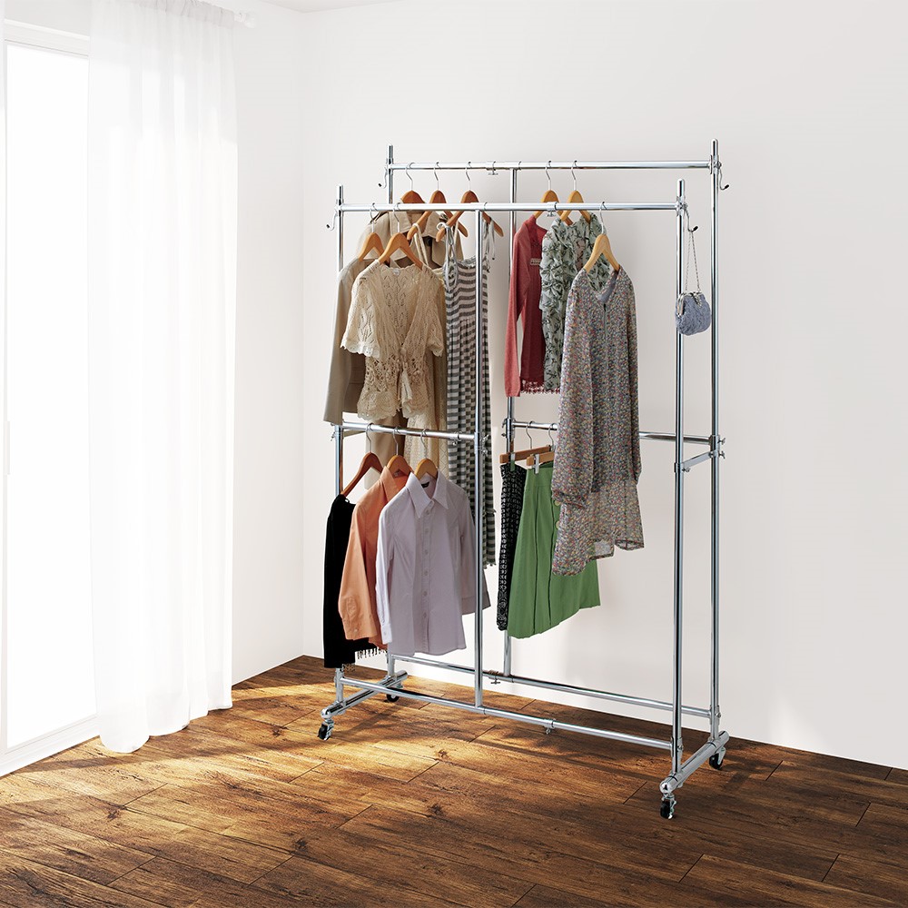 幅と高さが変えられるプロ仕様頑丈ハンガー 上下2段掛け付き ダブルタイプ・幅92cm-122cm ハンガーラック パイプハンガー 衣類収納 589316