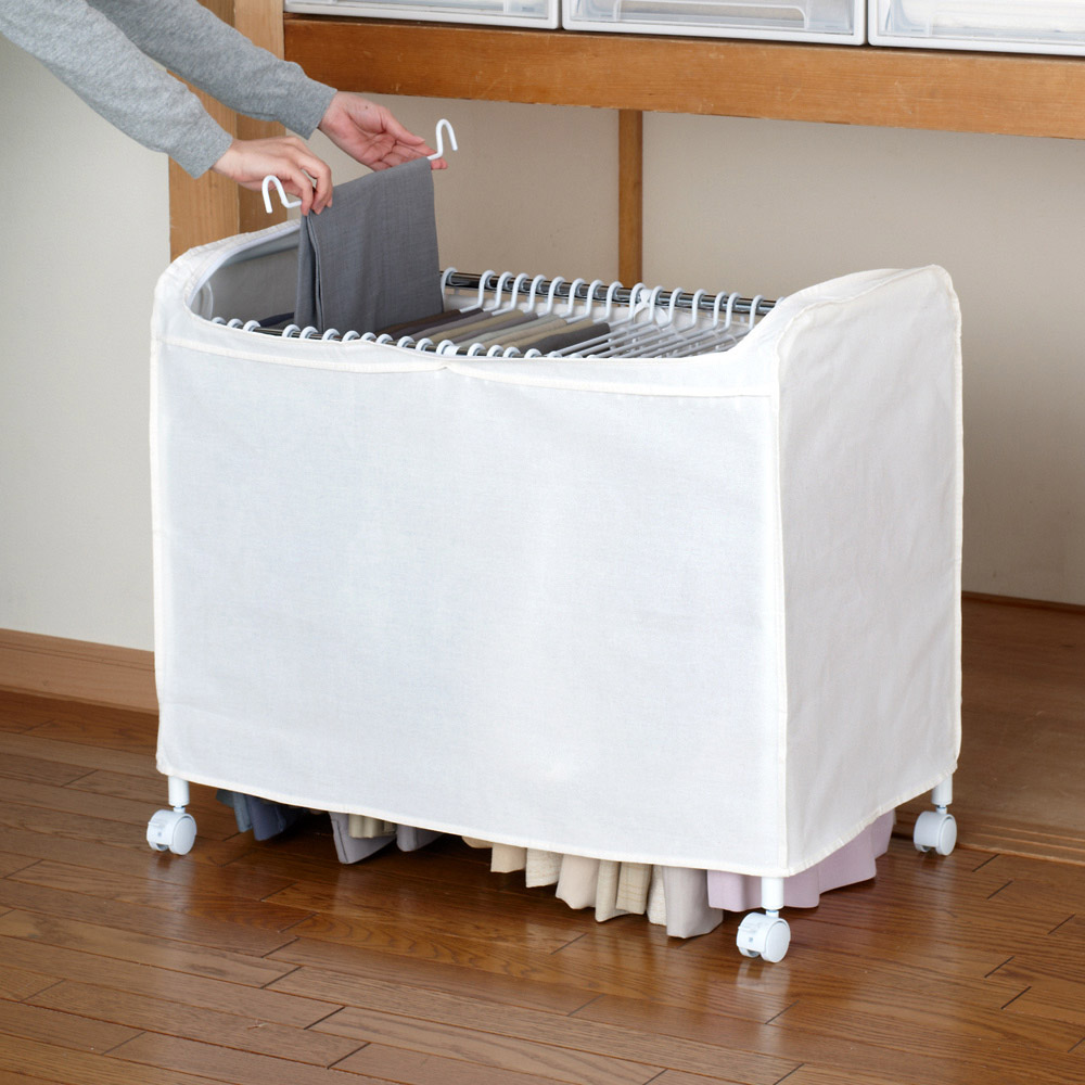 カバーを開けて、上からハンガーごと取り出して、スラックスを出し入れします。