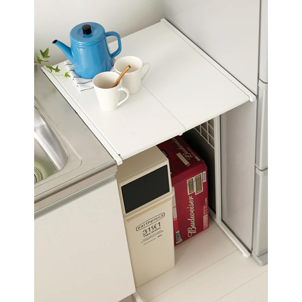 使用イメージ 幅が無段階に変えられ、空きスペースを幅ぴったりの作業台にプチリフォーム。 ※写真は奥行55cmタイプです。お届けはラックのみです。