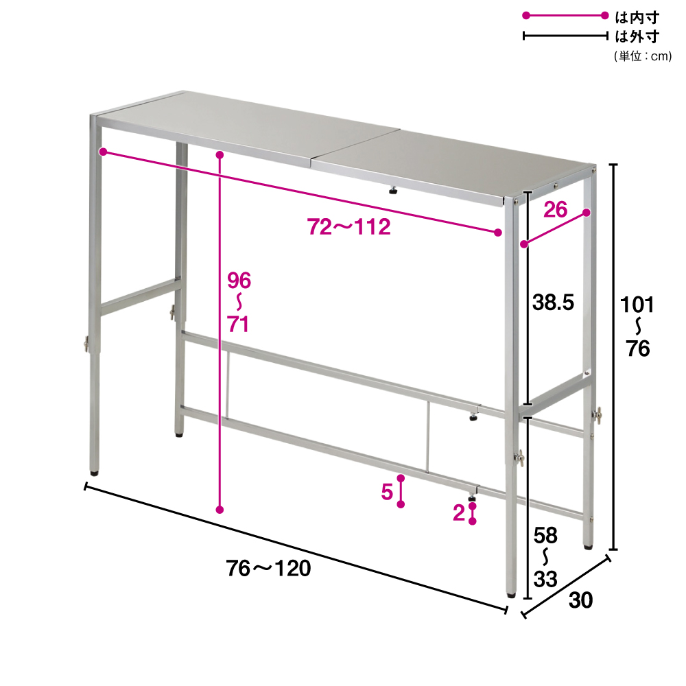 幅は対応範囲内で無段階に調節できます。天板の高さは5cm間隔で6段階(高さ76~101cm)に調節できます。