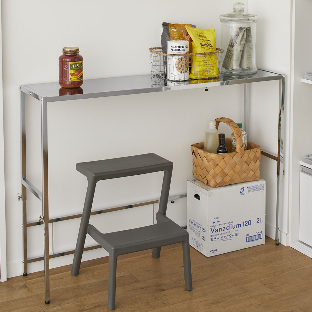 シンク脇などキッチンの空きスペースが便利な作業台に。高さと幅が伸縮するので、ご自宅のキッチンのサイズにぴったり合わせて調整できます。清潔さが続くステンレス製だから、調理後の片付けもラク。