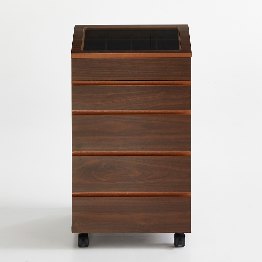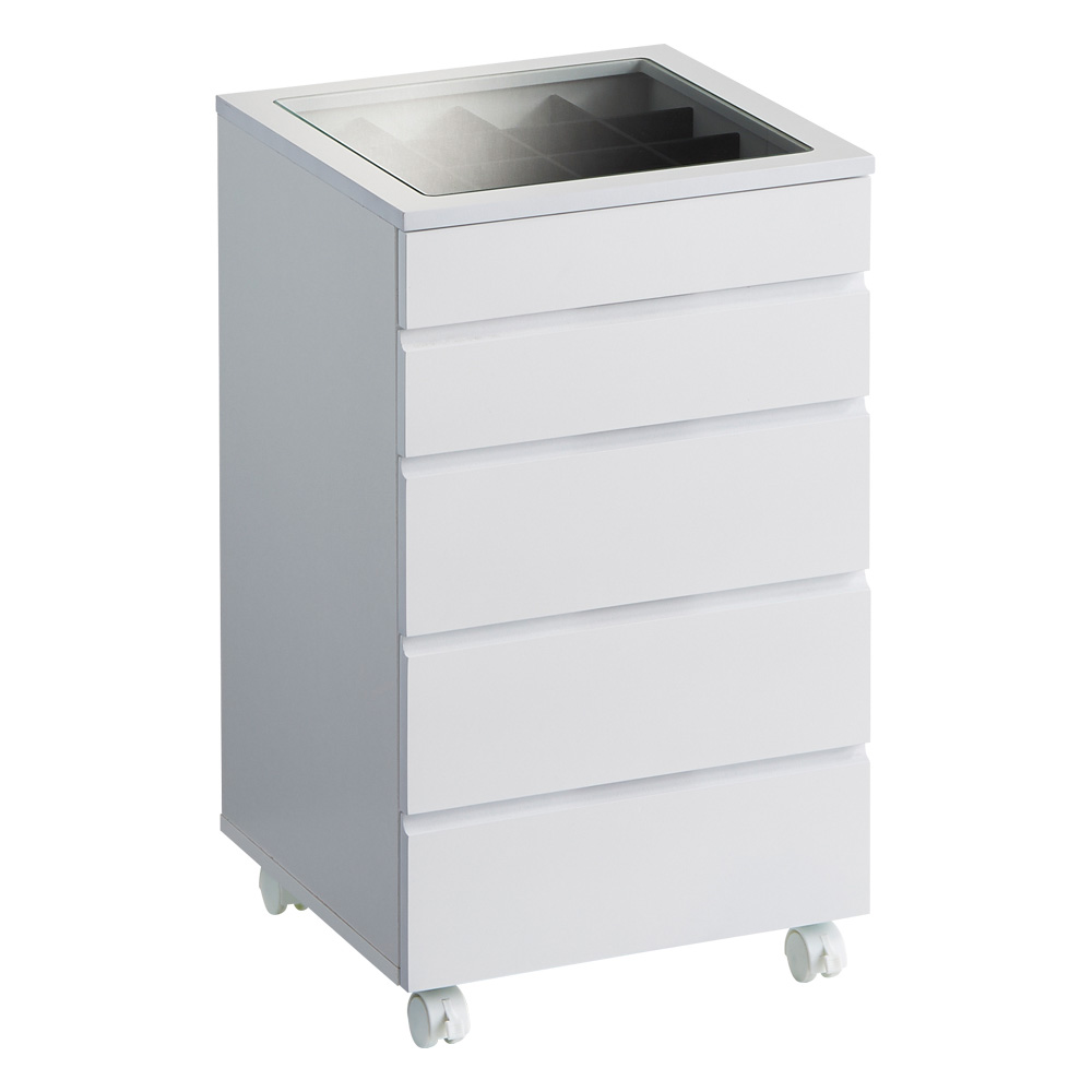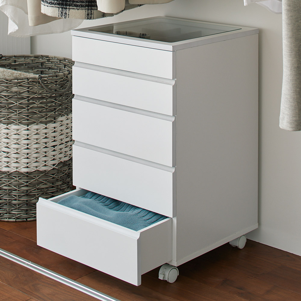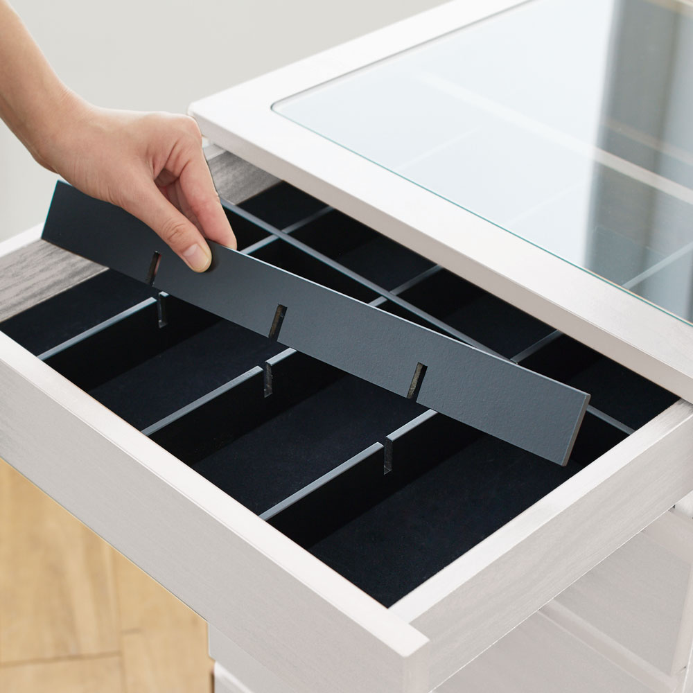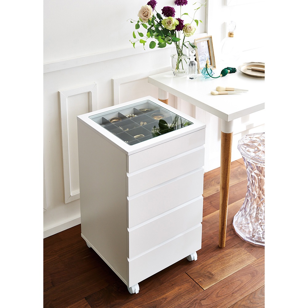 全5段の引き出しとガラス天板、仕切り付きで小さなジュエリーから衣類小物まで見やすく分類収納