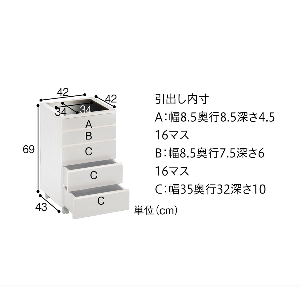 ■サイズ:幅42奥行43高さ69cm、引き出し奥行最上段36cm、他4段32cm