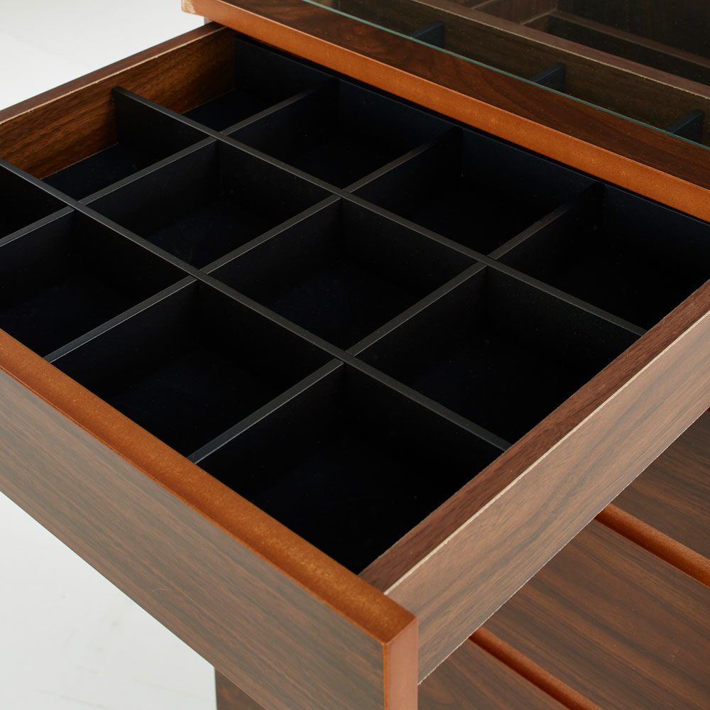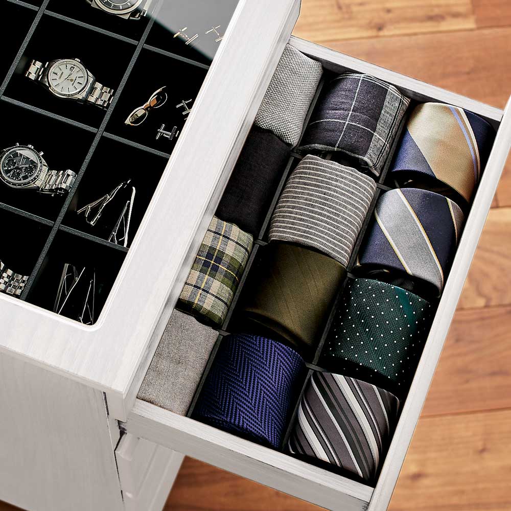 ◆上2段は仕切りで小分けしてジュエリー・小物類の収納として。仕切りは取り外しも可能で、収納したいものに合わせて調整が可能です。◆こまごまとしたアクセサリ類はもちろん、時計やヘアアクセサリ、男性ならネクタイやポケットチーフ、タイピンなどをまとめて管理できます。