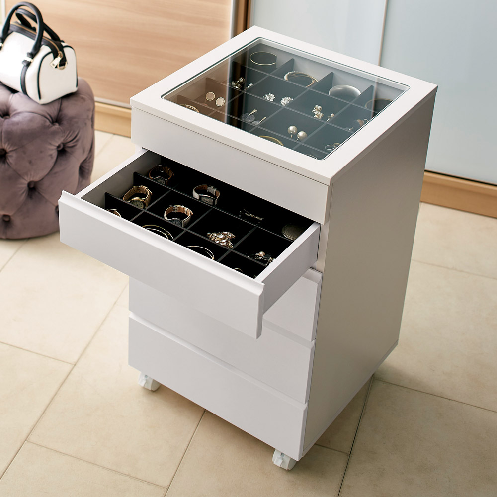 増え続けるジュエリーやスカーフ、ベルトなどの衣類小物をまとめて管理できるコンパクトなチェストワゴンです。