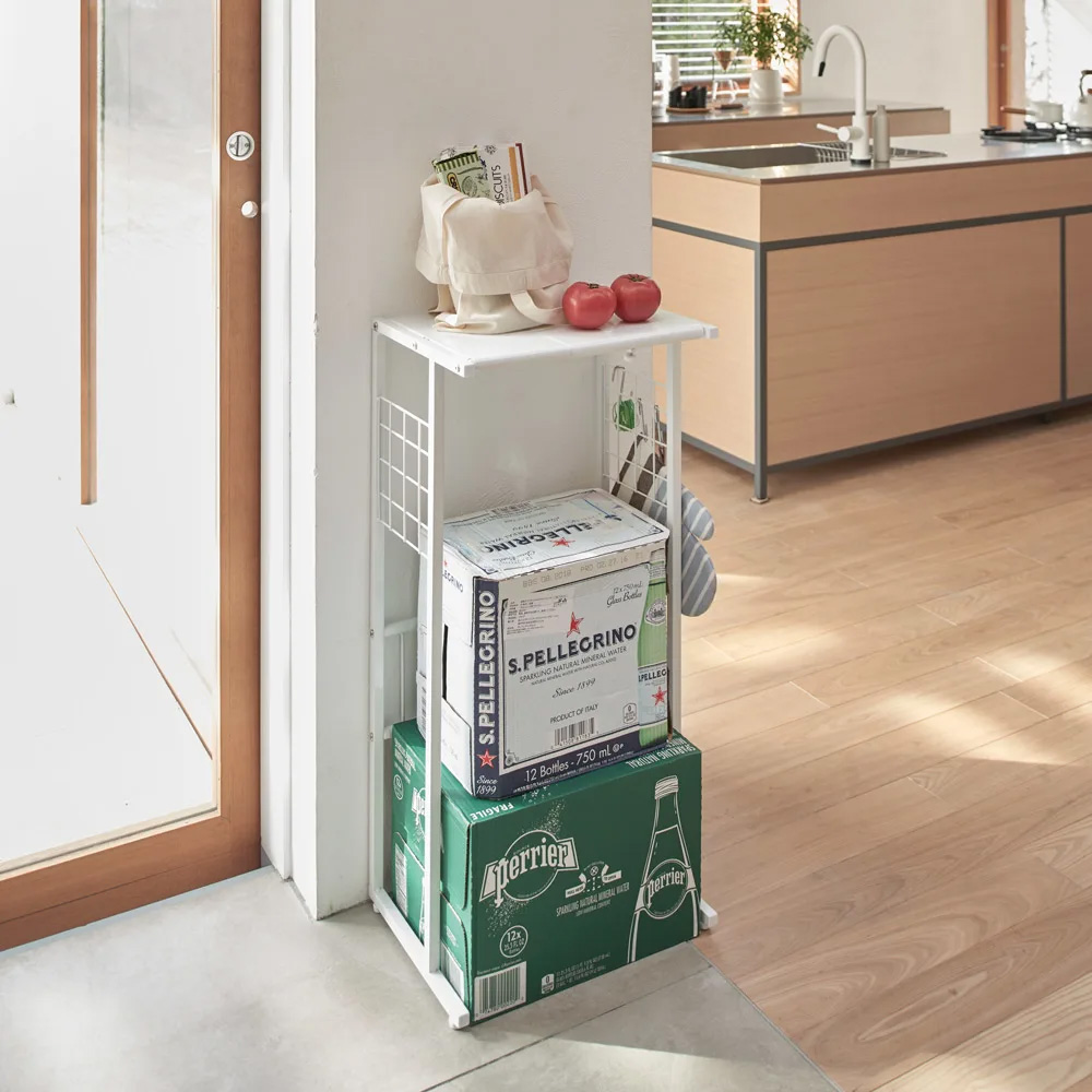 天板は買い物袋などのちょい置きに、下は飲料ケース置き場に活用。 ※写真は別売りのワイドタイプ奥行30cmです。