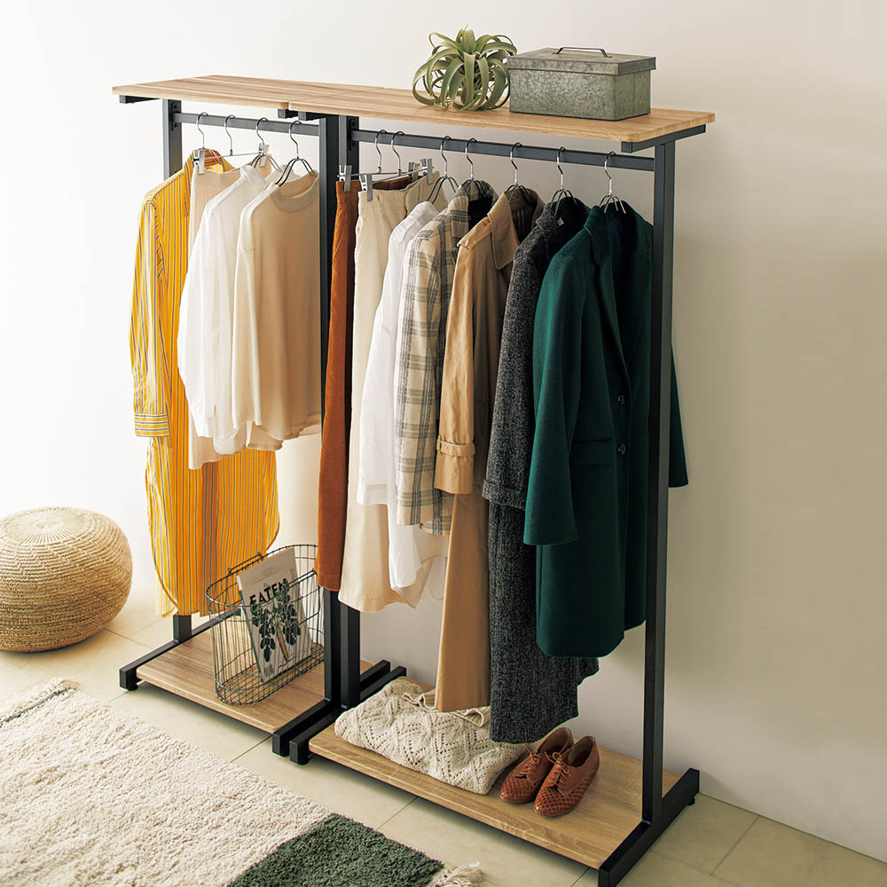 今人気のインダストリアルデザインがおしゃれな衣類収納ハンガーです。天然木のような風合いの棚とブラックアイアンが調和したヴィンテージ風デザイン。
