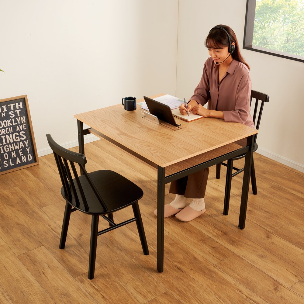 天板中央部分にスマホ・タブレットスタンド付きなので、動画を見たりリモート会議に大活躍! ※写真はテーブル幅90cmです。