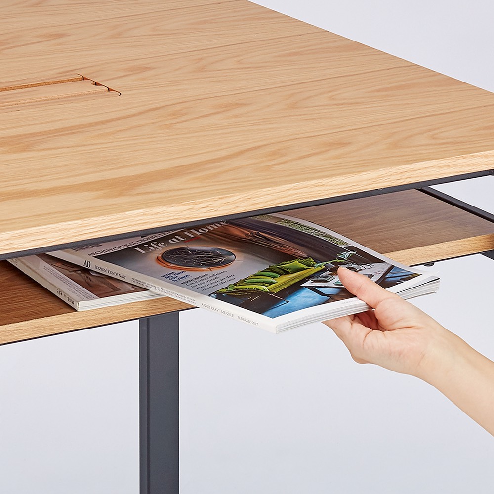 天板下は収納棚付きです。書類やPCの一時置きに便利。