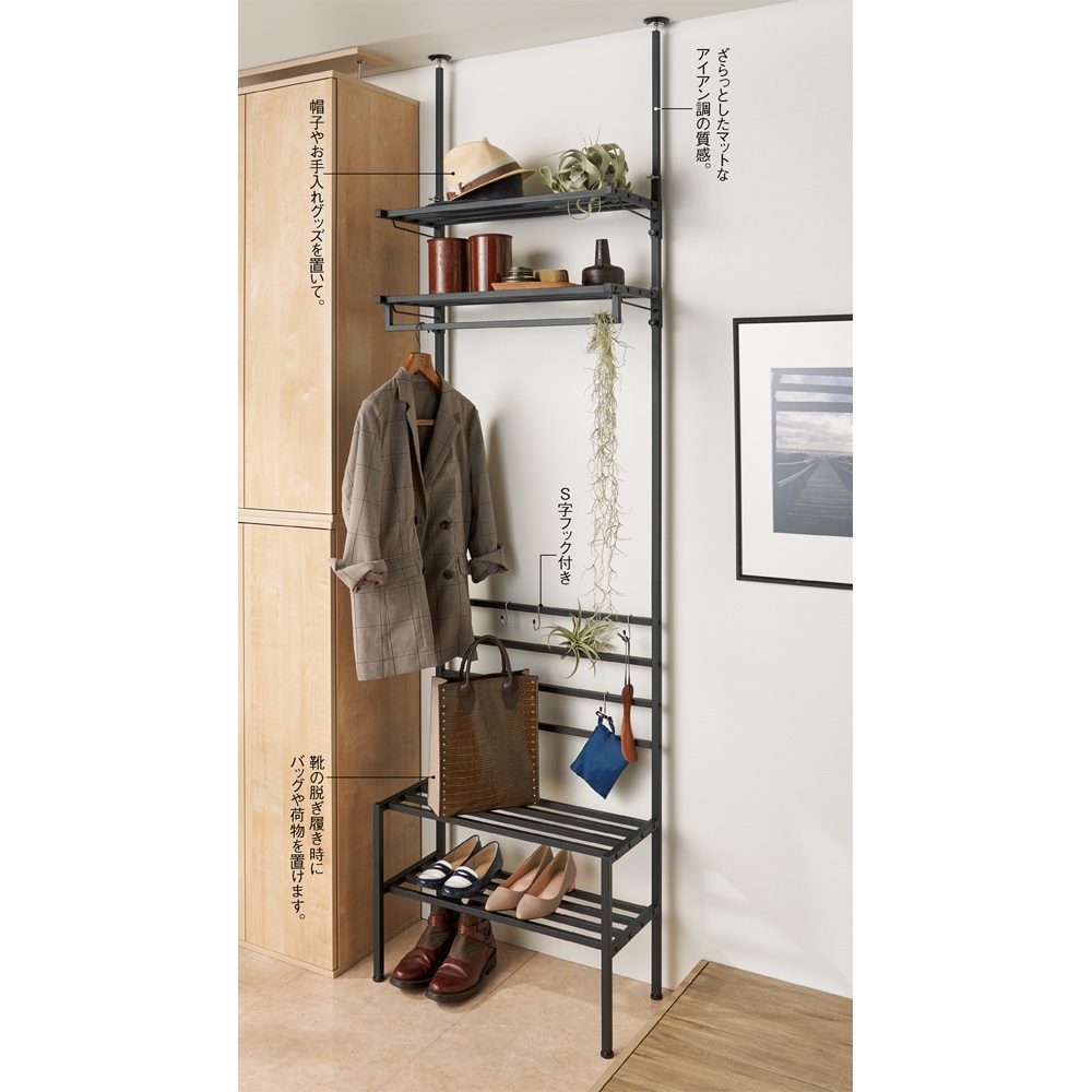 靴も上着も置きたいけど場所がないというお悩みを解決!このハイブリッドラックは下部がシューズラック、中段がハンガーラック、上部が荷物棚になっているので、これ一台で玄関をすっきり整えられます。