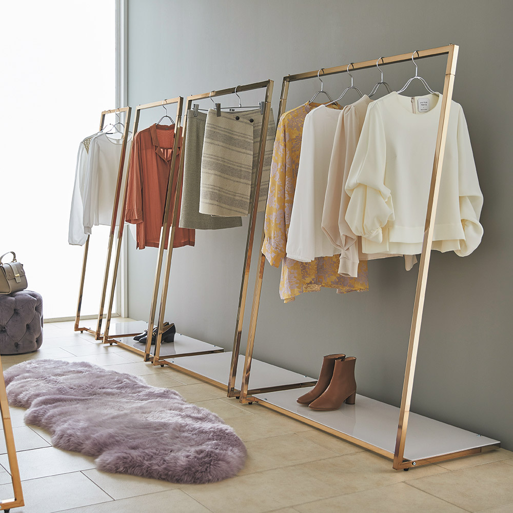 • ピンクがかったゴールドカラーがお部屋をラグジュアリーに格上げ。収納するだけでなく、お洋服を選ぶ時間を華やかに演出します。